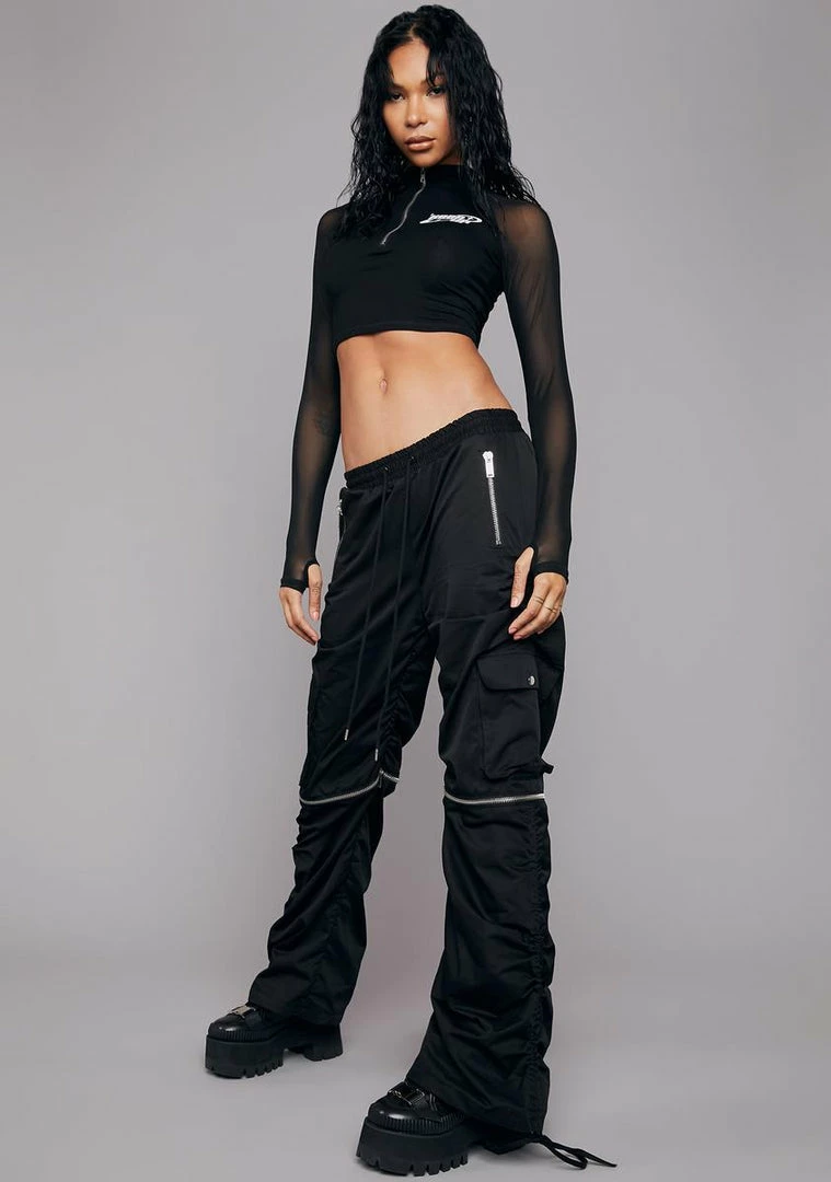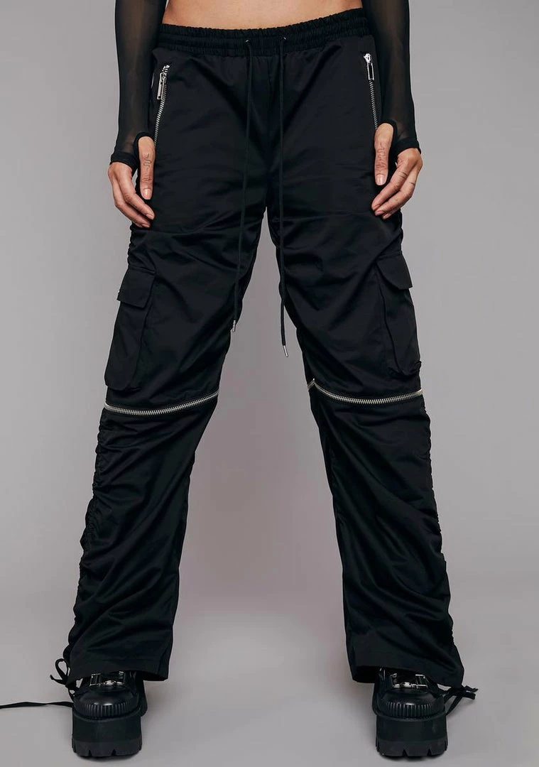 you don’t shy away from a challenge. Come out on top in these wide leg pants have that a drawstring waistband, cargo pockets, a baggy fit, ruching details along the sides with adjustable ties, and zippers at the knees to remove the legs and convert into shorts.