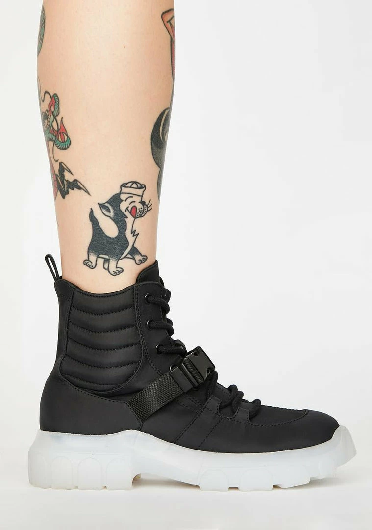 cuz your teamâs always gotchu, boo! The hype is for real when yer in these badazz ankle boots that have contrast treaded soles, sikk buckle straps across the top, cushioned ankles and adjustable lace-up closures.