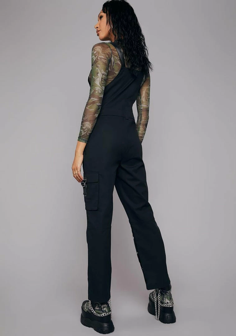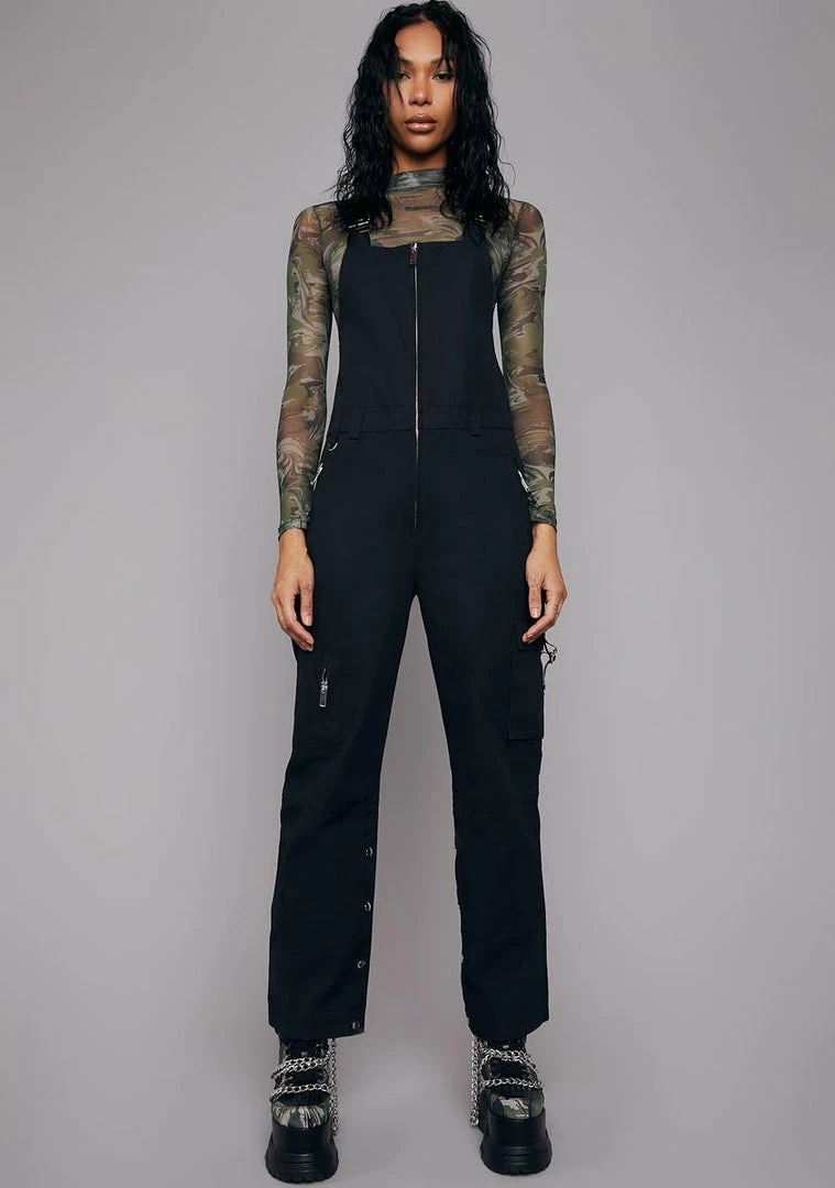 because I lick you lots, lover. Be my bf in this twill jumpsuit with adjustable shoulder straps, zipper details at the hip pockets and up the front, and a wide leg fit with button closures up the inner sides.