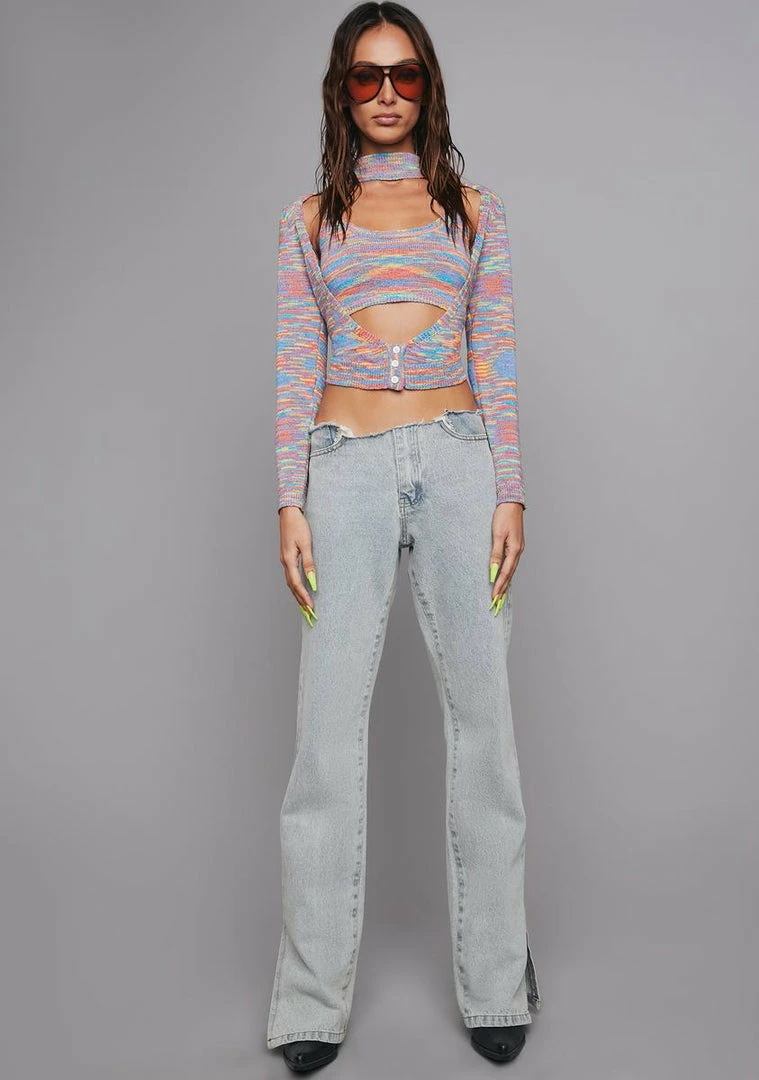 cuz I’m good on my own. This two piece set comes with an open front sweater, with button closures at the bottom, a neck strap detail, long sleeves, and a bando top with straps, both in a knitted space dye print.