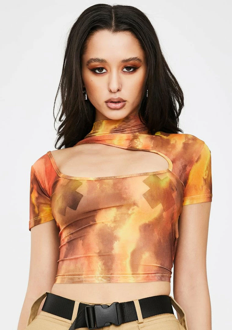 donât get mad, get a bag! The glow up is real in this short sleeve crop top that has a mock neckline, supa sheer tie dye print material Nâ a sexXxy âblessed never stressedâ front cut out.