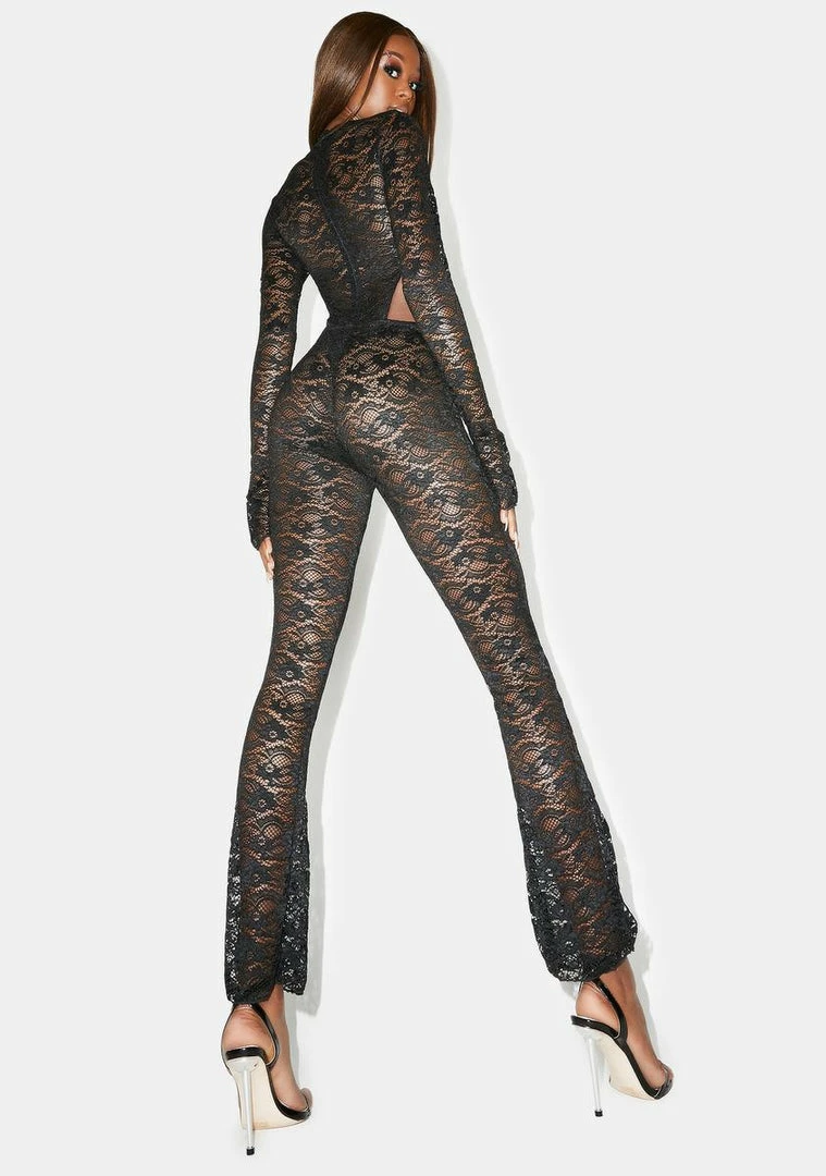 cuz you just canât help yourself! Have their head spinninâ with this sexy long sleeve catsuit that has a sheer floral lace construction, flirty side cut-outs, and a back zip closure.