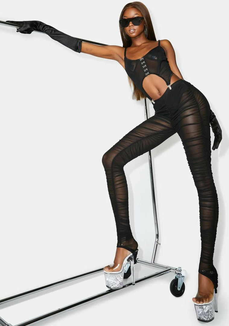 cuz no one can resist your temptations bb! Get em right where u want em while wearing this mesh bustier top with garter clips constructed into the hemline and hook and eye closures all the way up the front.
