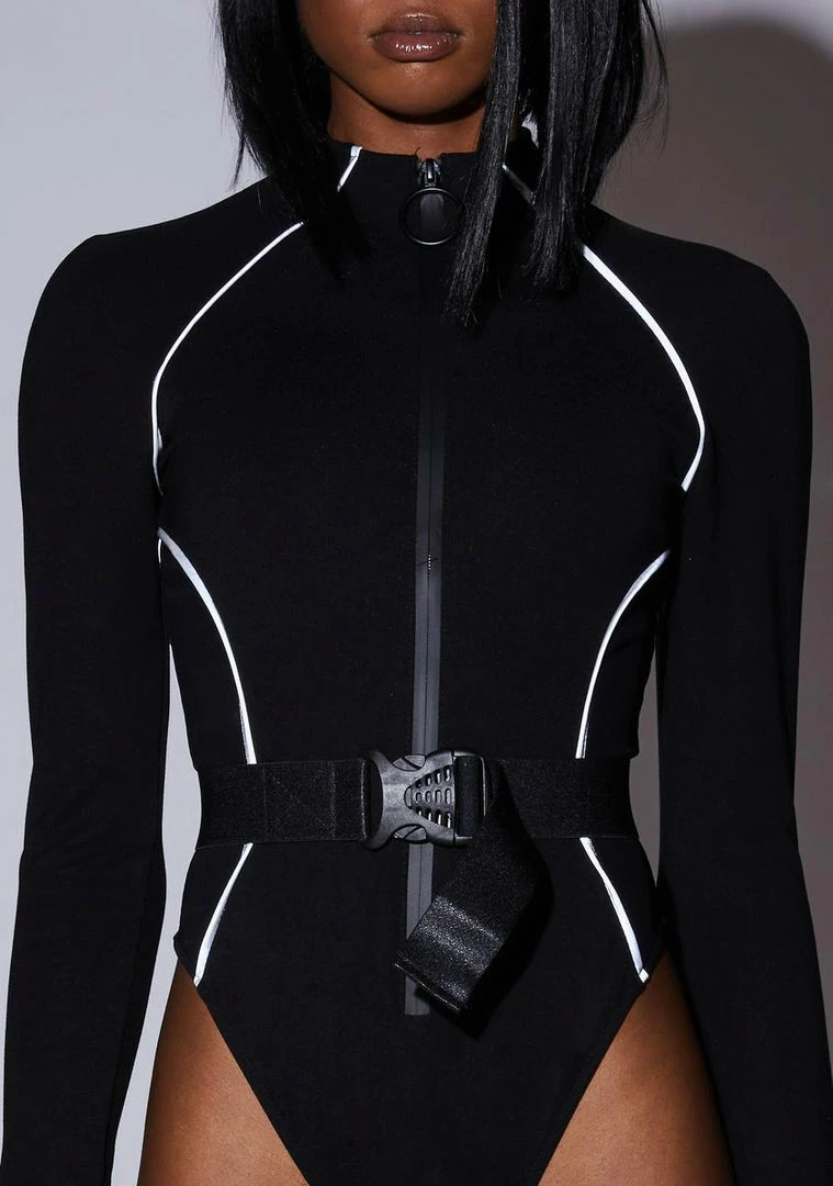 cuz you’re the best they never had! This long sleeve bodysuit has a mock neckline, mesh side panels, thumbholes, reflective trim, a front O-ring zip closure, and a buckle belt.