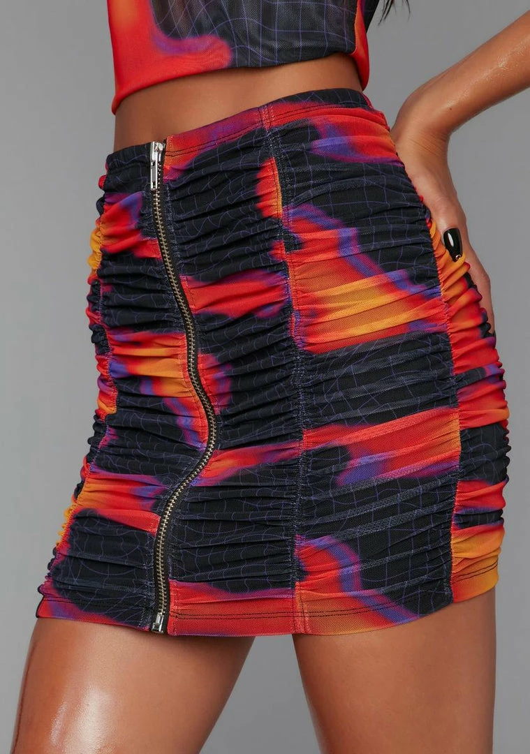 caution: too hot to handle. This smoldering mini skirt has a high waist fit, a zip up front, and a ruched mesh construction with a heatmap print all over.