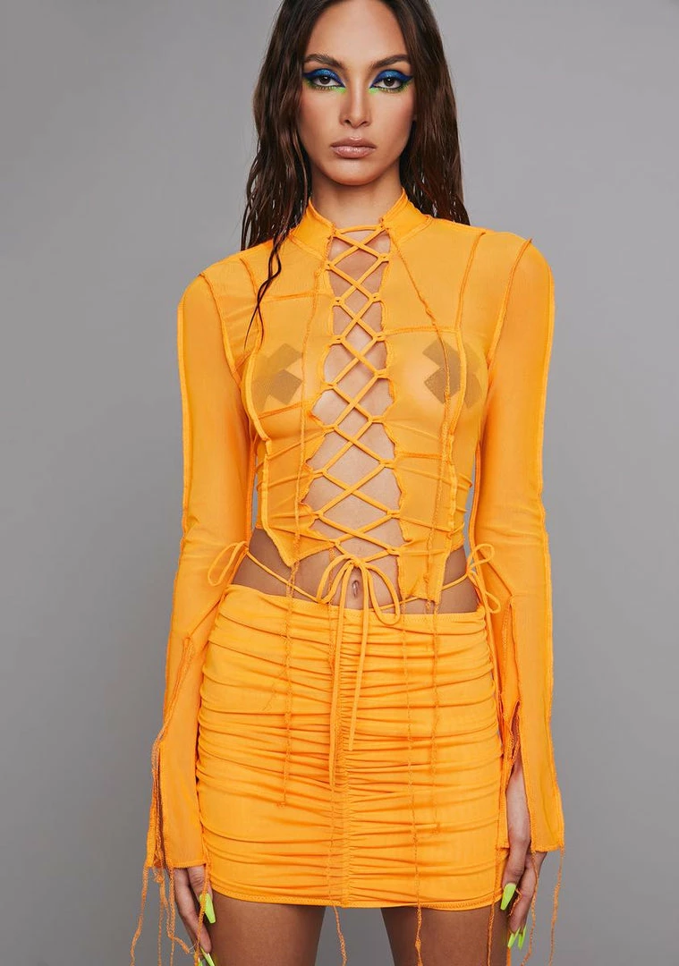 you donât mind a sweat from the sun! This stretchy mesh two-piece set has a long sleeve lace-up crop top with raised stitching, fringe details, a mock neckline, and a matching ruched mini skirt with waist tie straps.