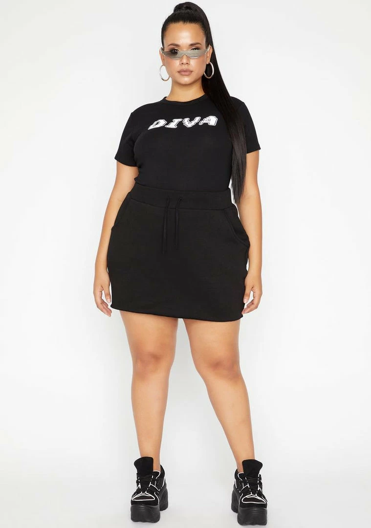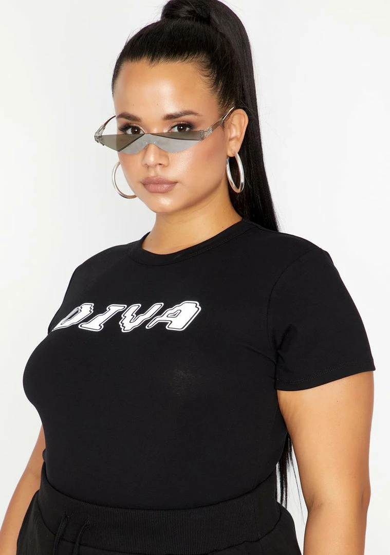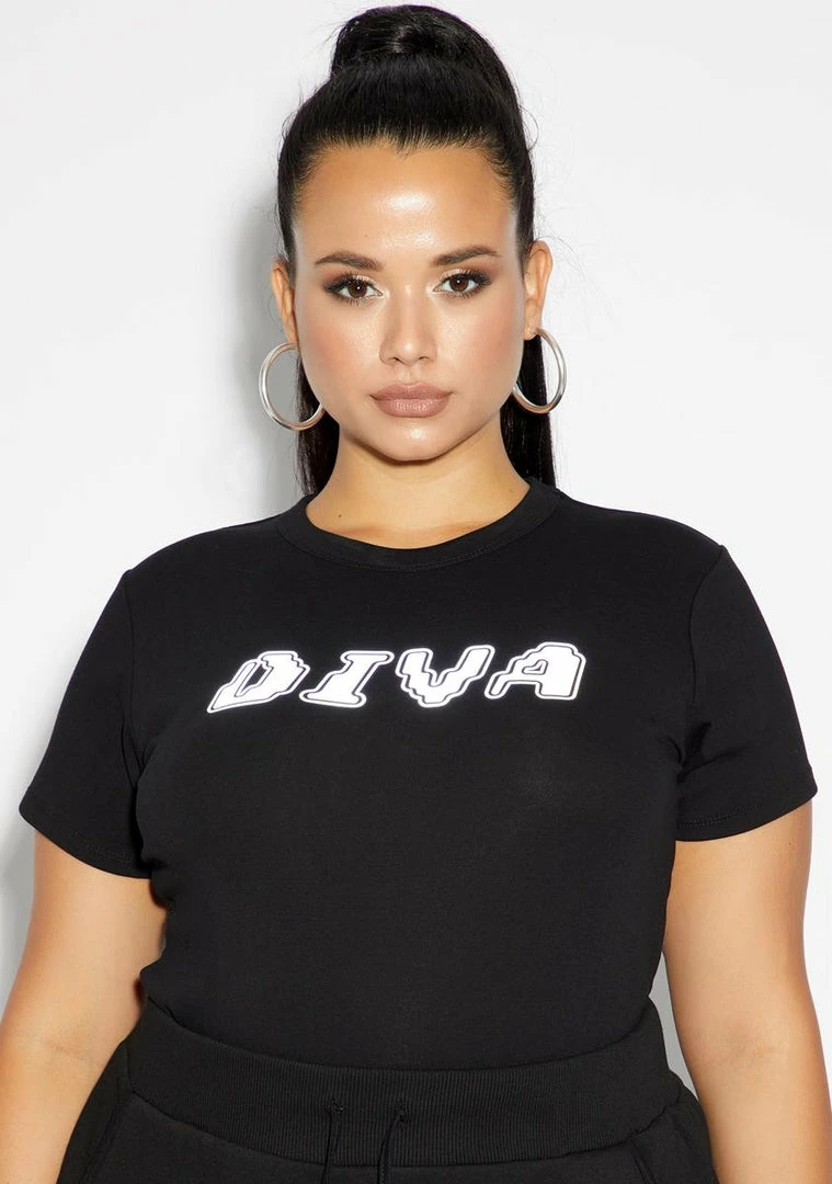 cuz a diva is a female version of a hustla! Let âem know hunty in this bo$$ lil graphic tee that has a crew neckline, sassy reflective script across the front Nâ a shrunken fit.