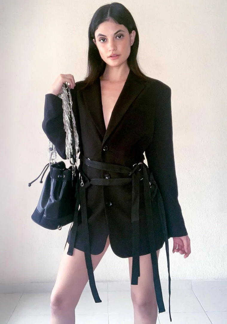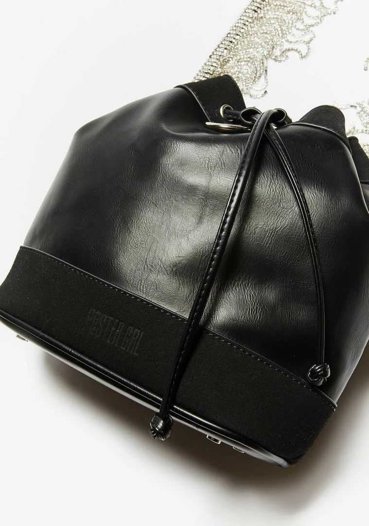 got em emptyinâ their pockets bb! Let em know u mean bizness carrying this drawstring bag with a vegan leather construction, drawstring closure and rhinestone fringe strap.