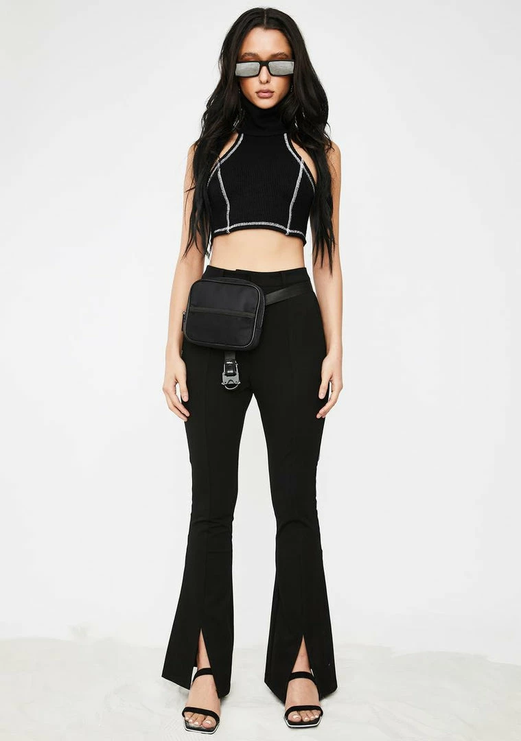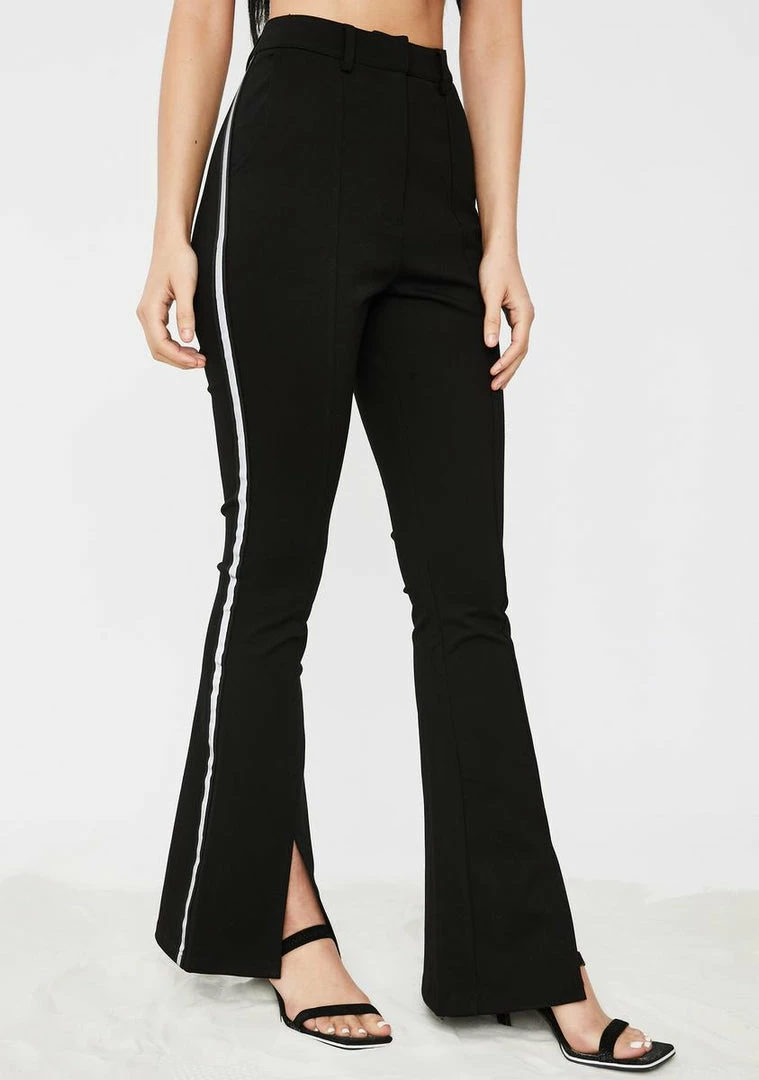 make âem invest, bae. Give âem high fa$hion in these high waist bottoms that have a sikk reflective side stripe, front hook N’ zip closures, side pockets Nâ flared split hem.