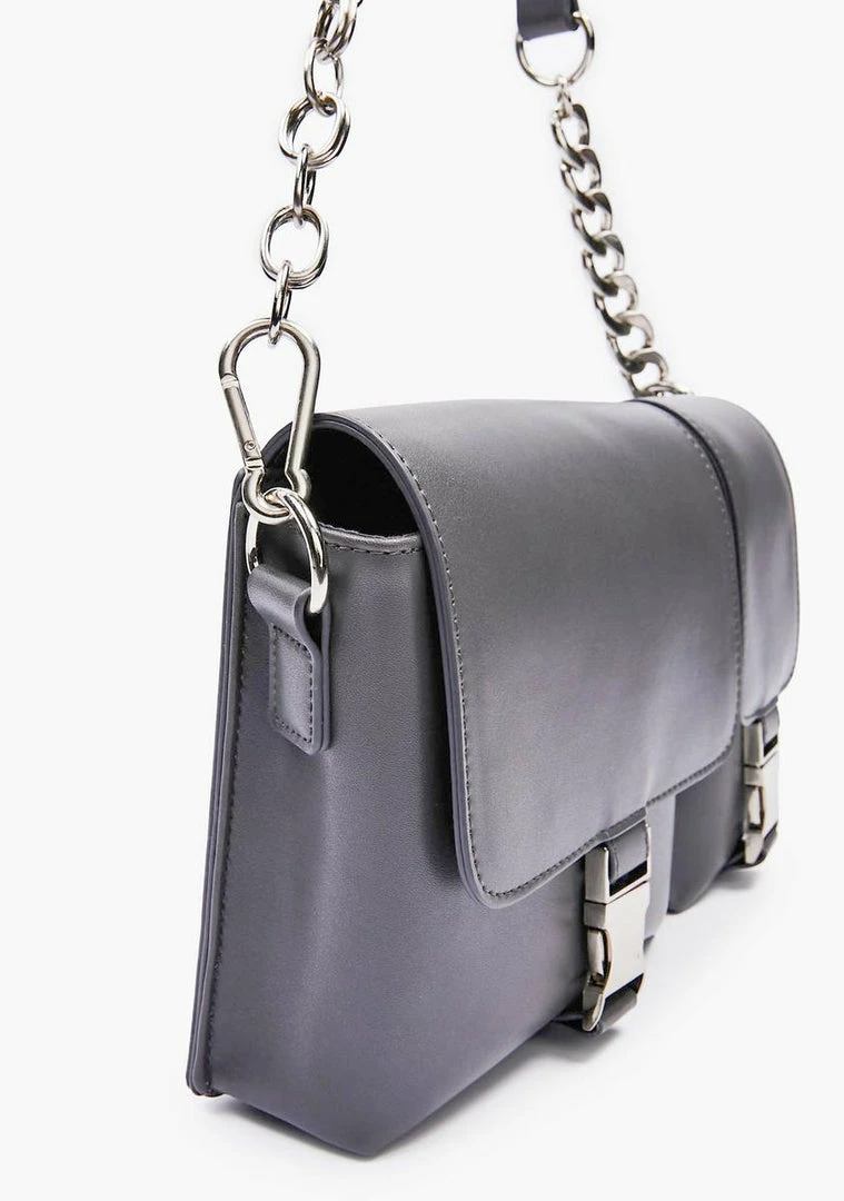 I’m all hung up on u. This shoulder bag has a vegan leather construction, detachable chain strap with a carabiner connector, and two pockets with foldover flaps that have metallic buckle closures.