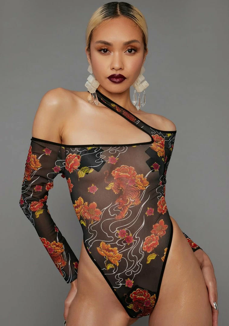 cuz you wear your heart on your sleeve. This sheer bodysuit has a tattoo print all over, one cross shoulder strap, and long sleeves.