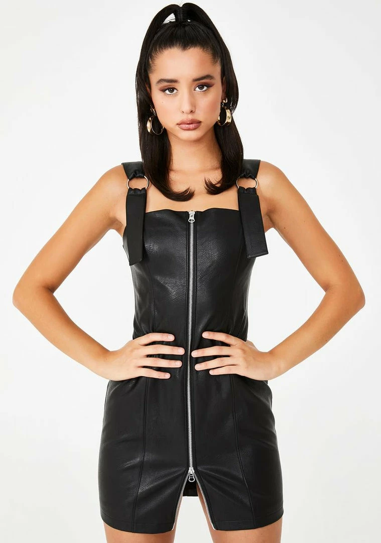 got ya thirsty for payback, boo. Yer out to get âem in this ultra bad bish vegan leather mini dress that has platinum O-ring hardware, adjustable shoulder straps and a hawt front zip closure.