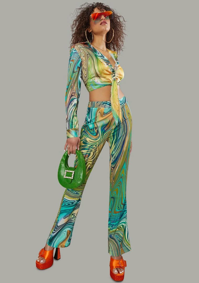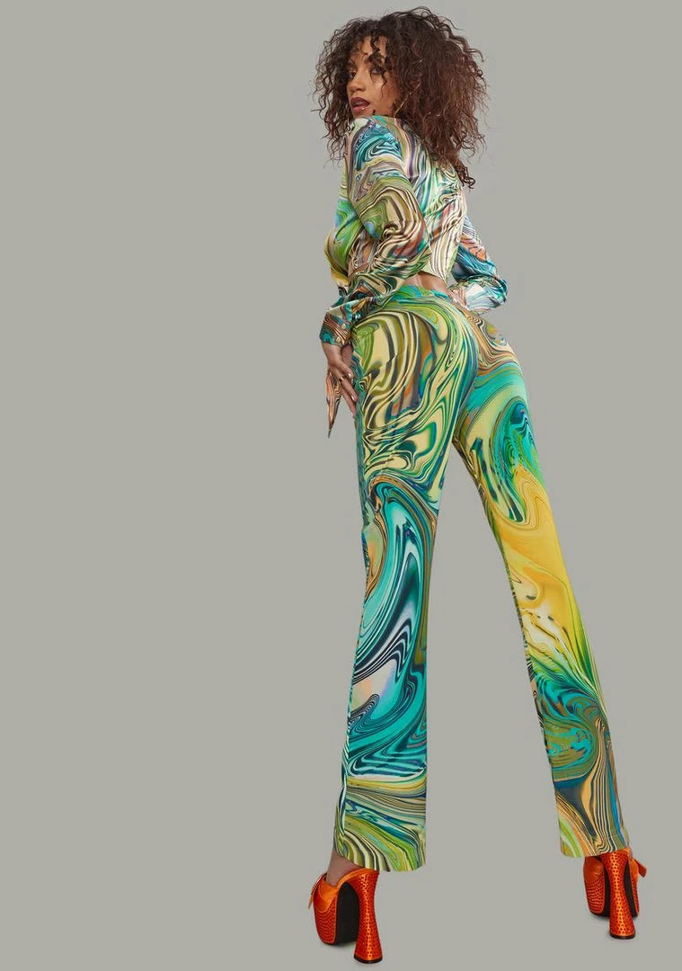 cuz you leave âem in a trance, babe. These kick flare pants have a stretchy material with a swirl print all over, a high waist fit, and an elastic waistband.