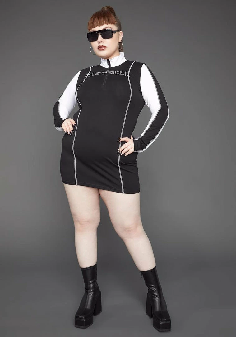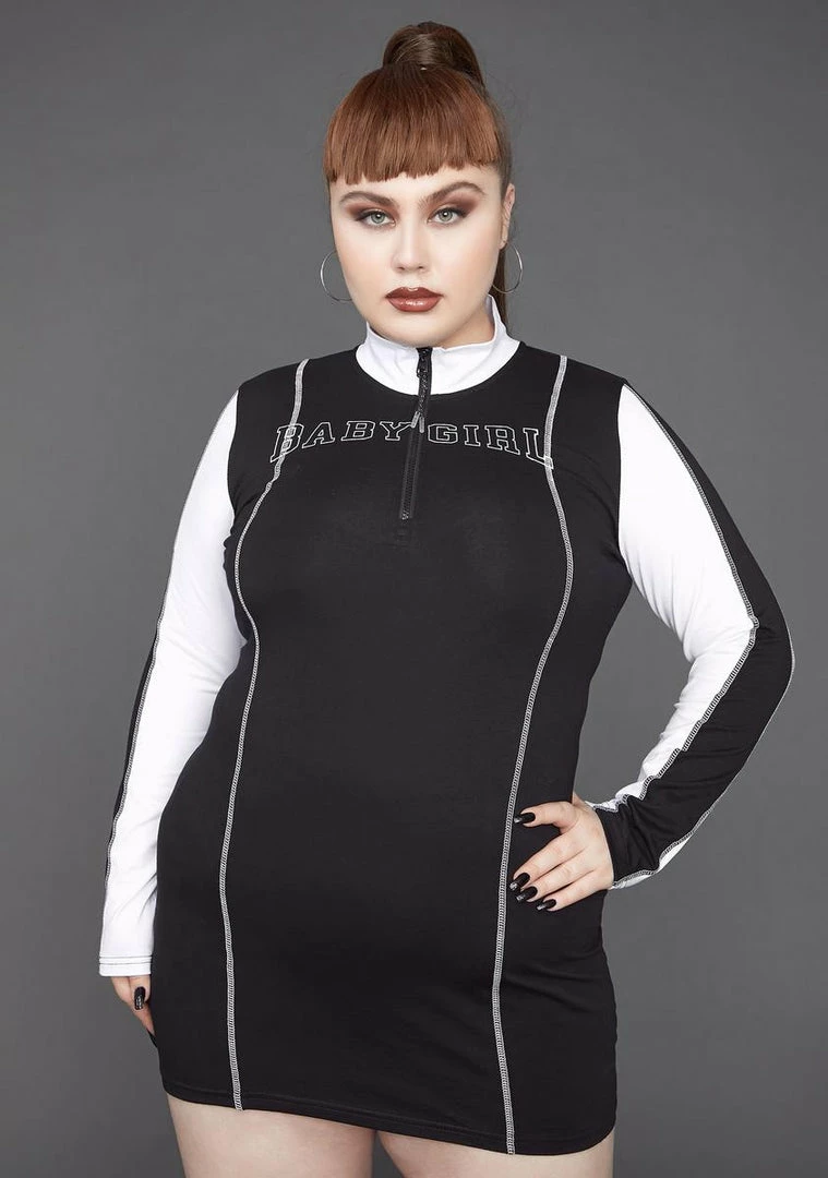 good things come to those who hustle. This sporty bodycon dress has long colorblock sleeves, a quarter zip mock neckline, contrast stitching, and embroidery on the chest that reads âBABY GIRLâ.