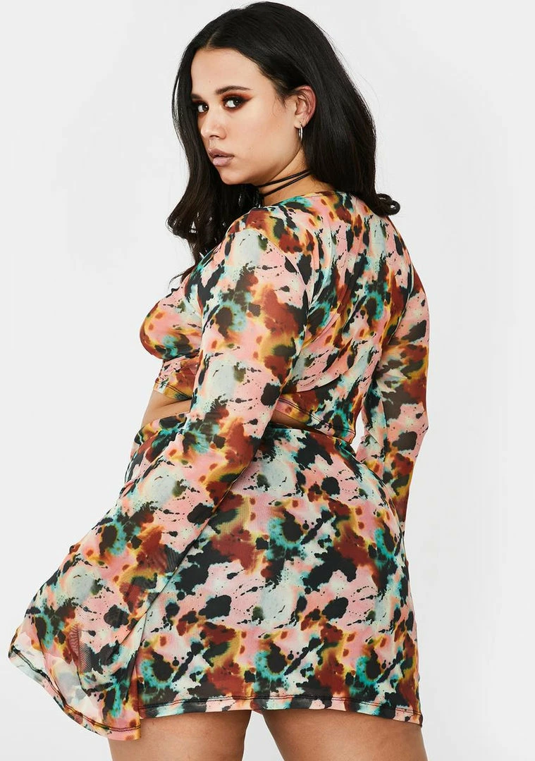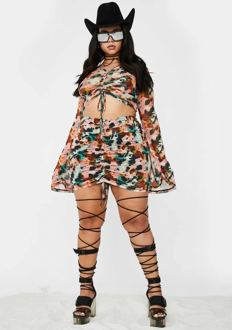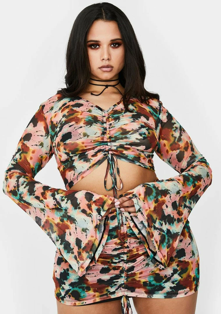 where my bag at?! If it doesnât make money it doesnât make sense in this matching crop top Nâ mini skirt set that has a supa sheer mesh material, sikk ink blot print all ova, long sleeves and a flirty ruched design to have âem swipe those visas.