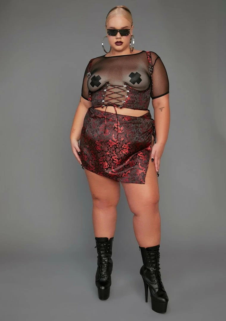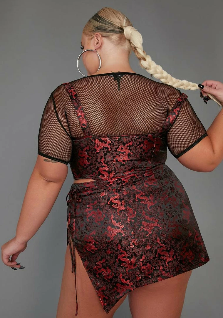cuz youâre ready for anything. Maximize your exposure in this mini wrap skirt that has a brocade dragon print with a tie closure and slit.