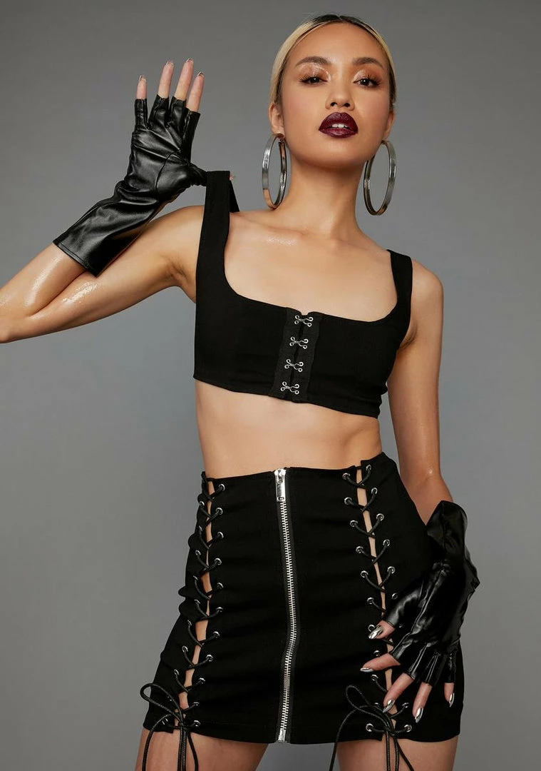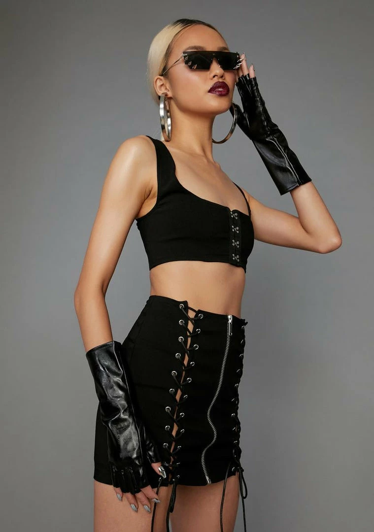 you know all your angles. Werk it till you can’t no more in this two piece set that includes a bra top with hook n’ eye closures and a high waist mini skirt with lace up details and a zipper closure.
