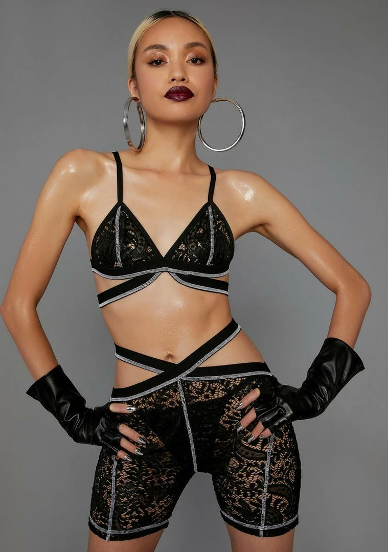 cuz you have to shine bright.This biker short set comes with a lace bralette and shorts with a cut out design.