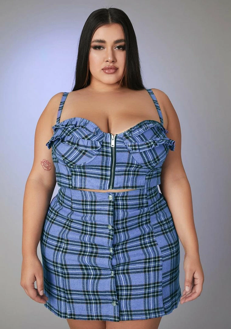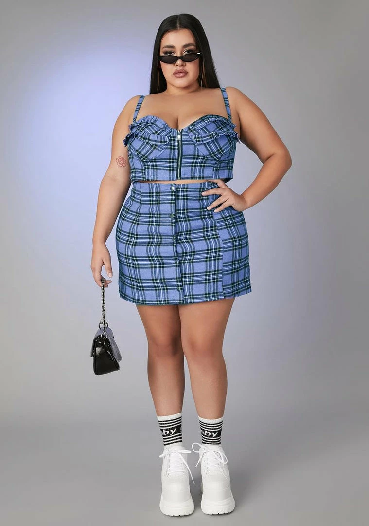 cuz youâre on the watch. This plaid top has a zipper detailing with a matching button up skirt.