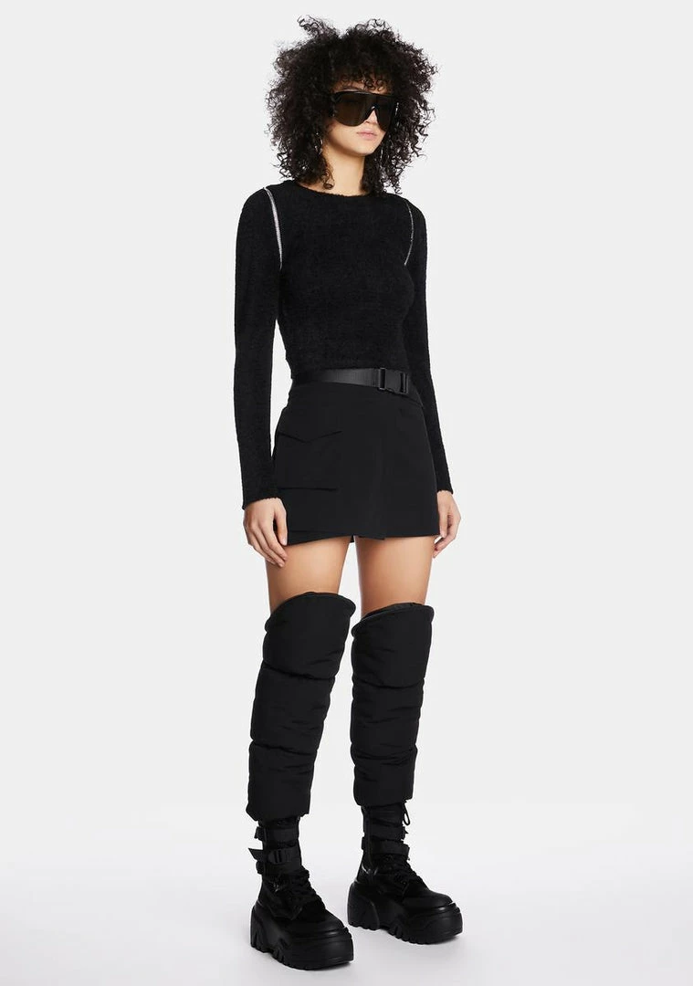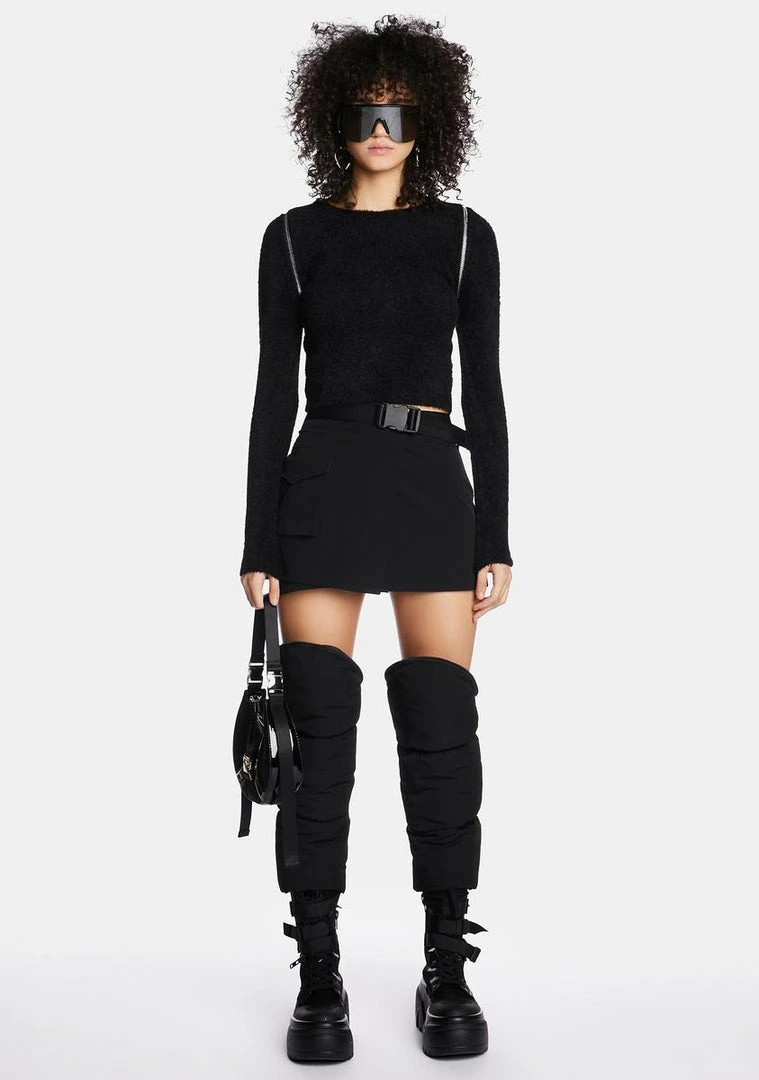 cuz you have all the right moves. This sweater has a fuzzy knit construction, detachable long sleeves with zipper closures, and a cropped fit.