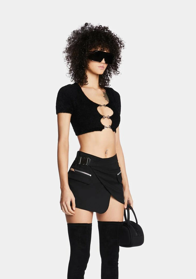 cuz what will you find. This mini skirt has a twill construction, a wrap design with an adjustable metal buckle closure, pockets with decorative zipper flaps, and a low rise fit.