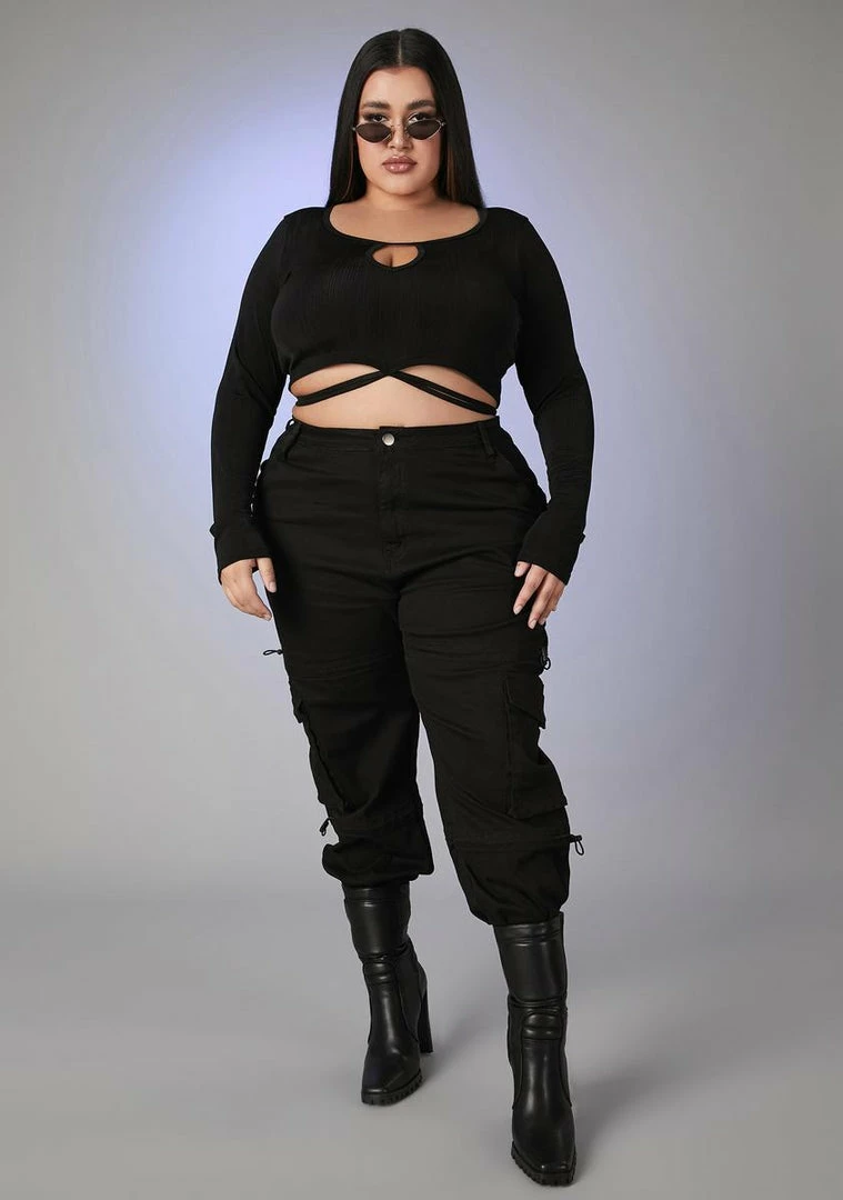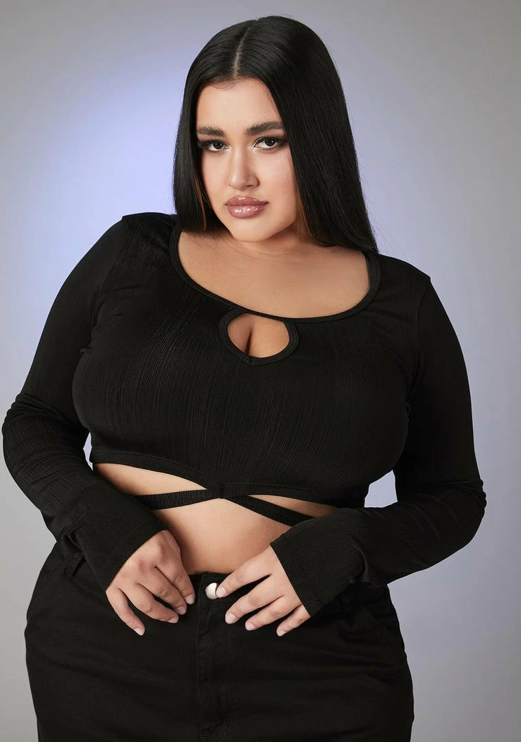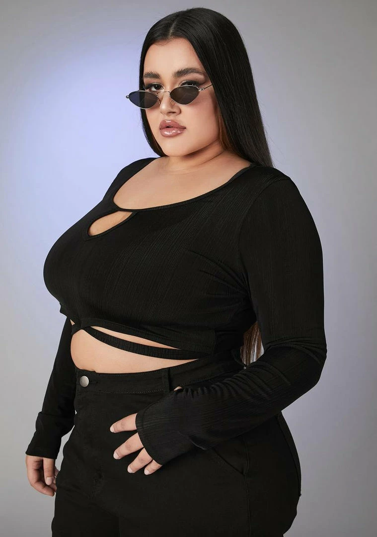 because they see right through you. This long sleeve crop top has a tie front and a keyhole cut-out design.