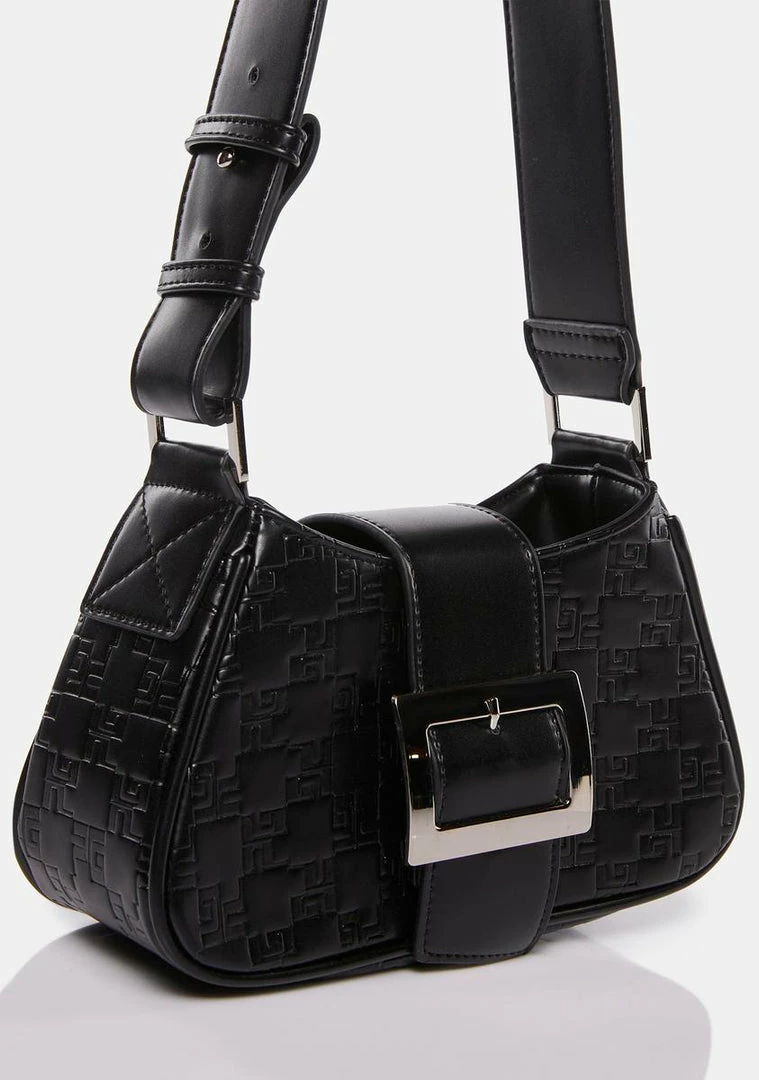 are you willing to risk it all? This shoulder bag has a vegan leather construction, branded monogram debossing, a top zip closure, a buckled strap at front, and an adjustable shoulder strap.