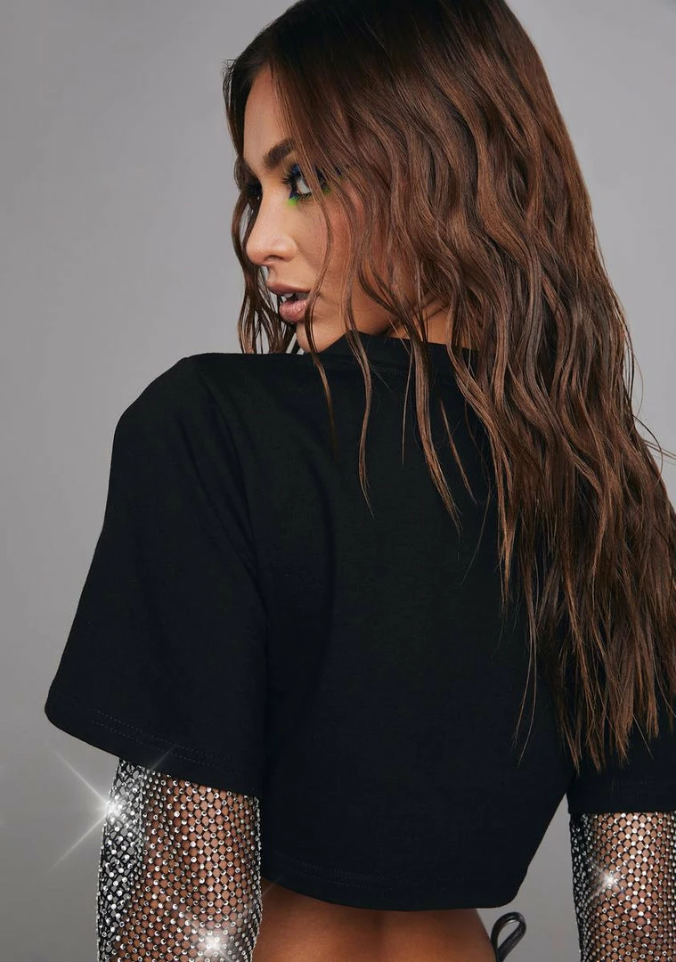 cuz they’ll never forget your name. This “pretty lethal” graphic tee has a boxy cropped fit, fishnet sleeves with rhinestone embellishments, and a crew neckline.