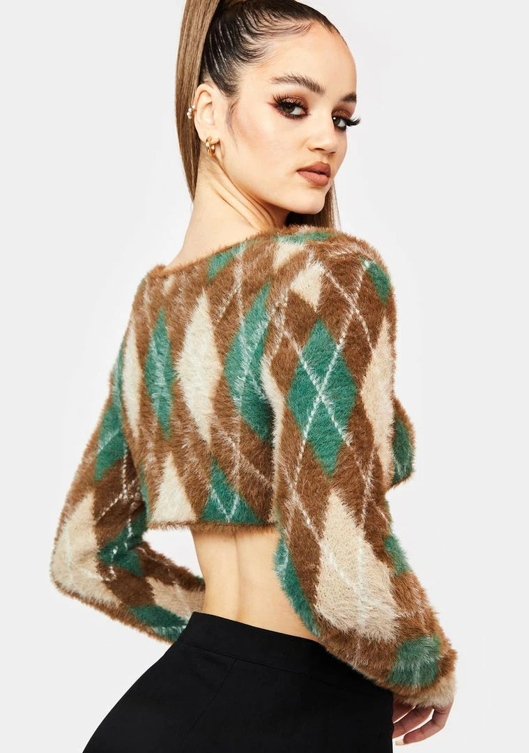 cuz you’re teaching the teacher. This sweater has a fuzzy knit construction, a cropped waist, a scoop neckline, buttons up the front, and an argyle print all over.