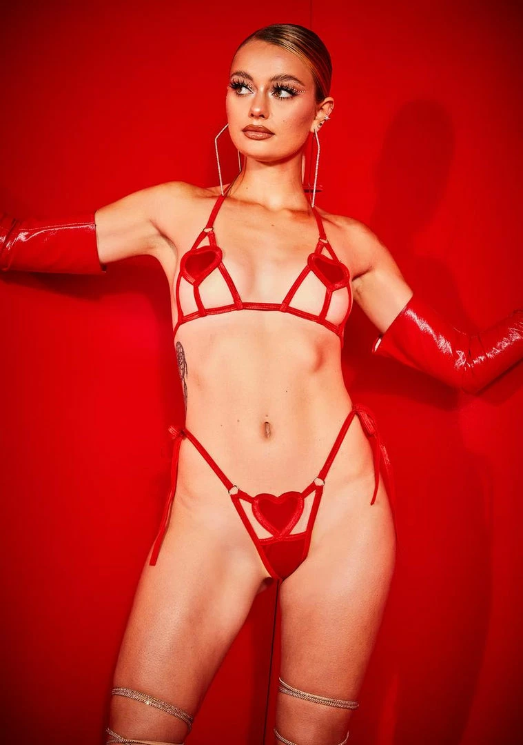 cuz you wear your heart on your lingerie but never on your sleeve. Yer alwayz the first to run in this strappy bondage lingerie set that includes a cut-out bikini top with lil heart patches Nâ tie straps and a thong bikini bottom with sexy cut-outs, side tie straps Nâ a heart embellishment.
