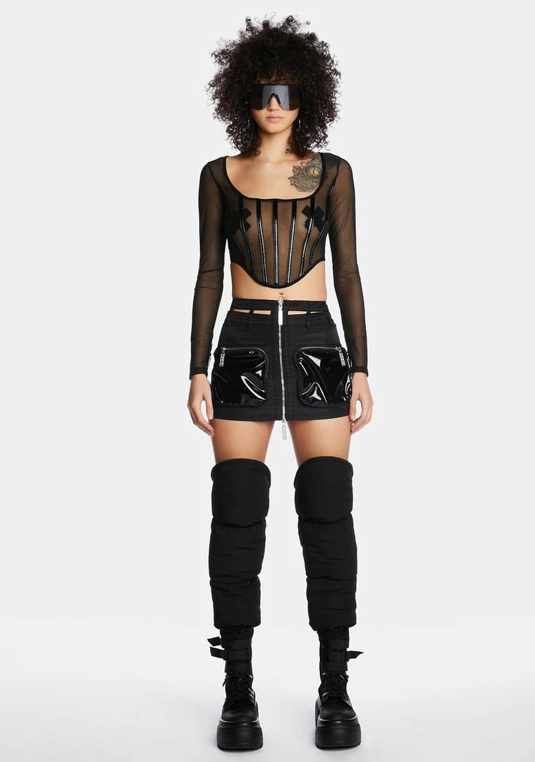 never missing, never found. This high-waisted mini skirt has a lightweight nylon construction, patent vegan leather zippered pockets, waist cutouts, and a front double-zip closure.