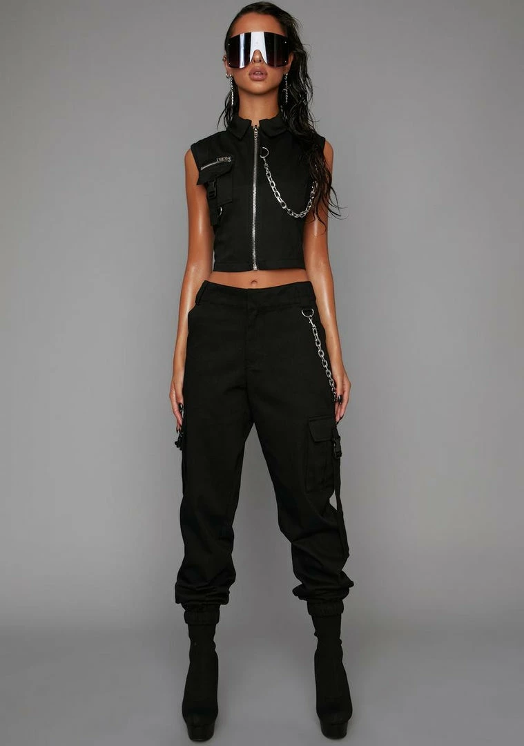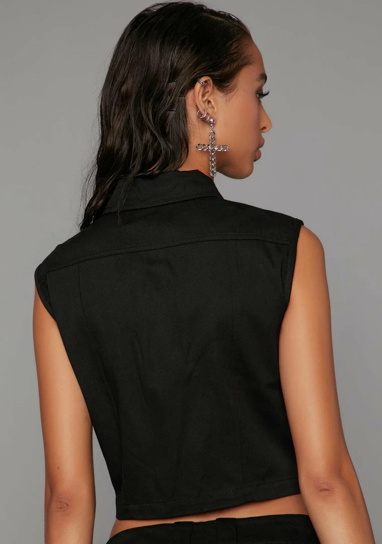 for doing whatever it takes. This military top has cap sleeves, a high neckline with a pointed collar, breast pocket, removable chain detail and front zip closure.