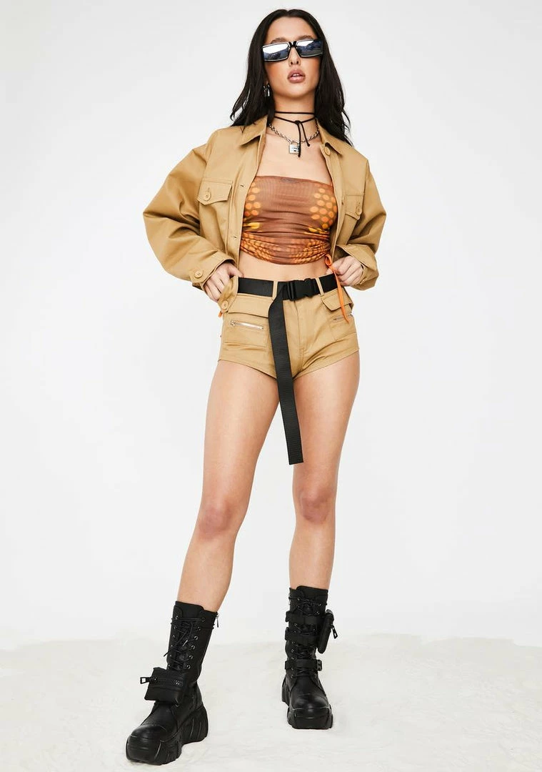 when ya got more designer fittings than you can count, boo. Your agentâs got ya on a tight schedule in these bad bish utility shorts that have front cargo pockets, a high waist fit, a button zip closure and come with a dope AF adjustable buckle belt.