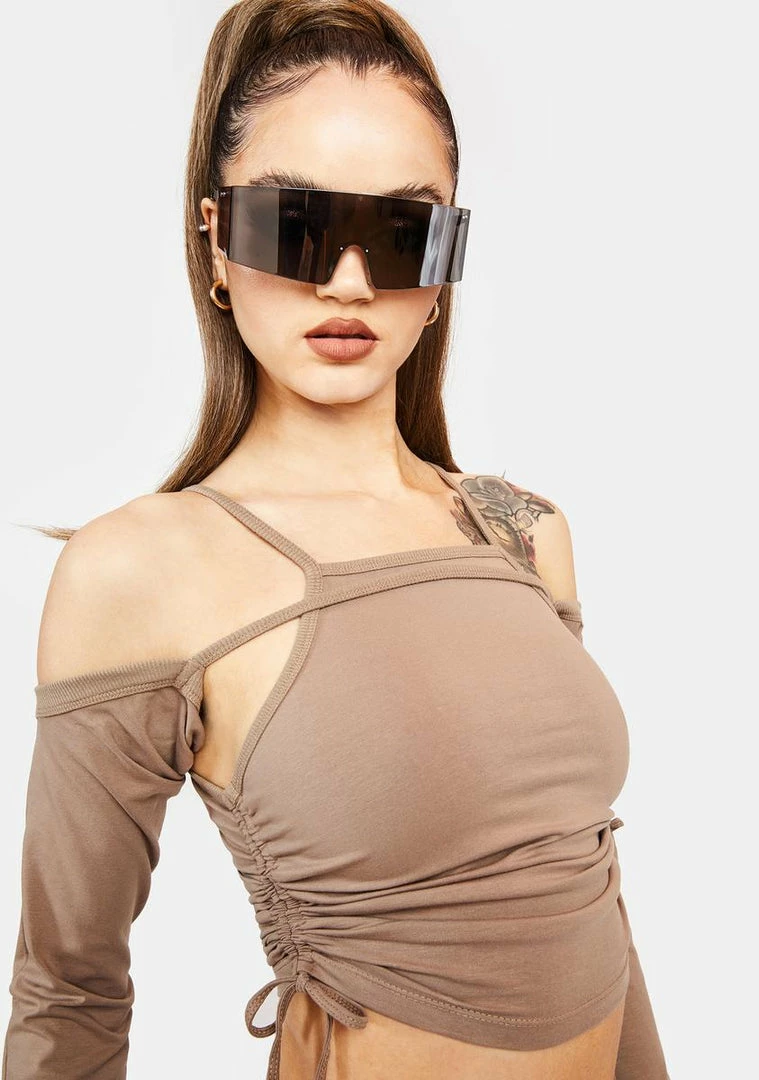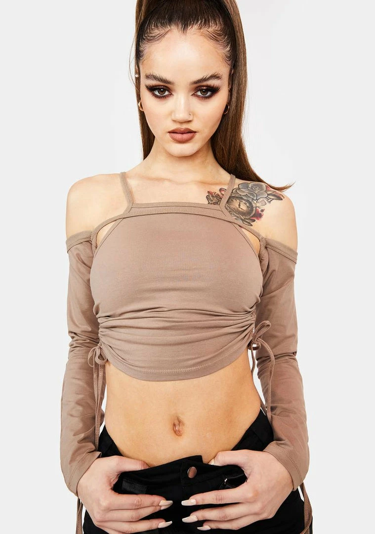 and don’t forget to follow! This ruched two-piece set has a crop tank with adjustable side drawstrings and a matching long sleeve off the shoulder shrug.