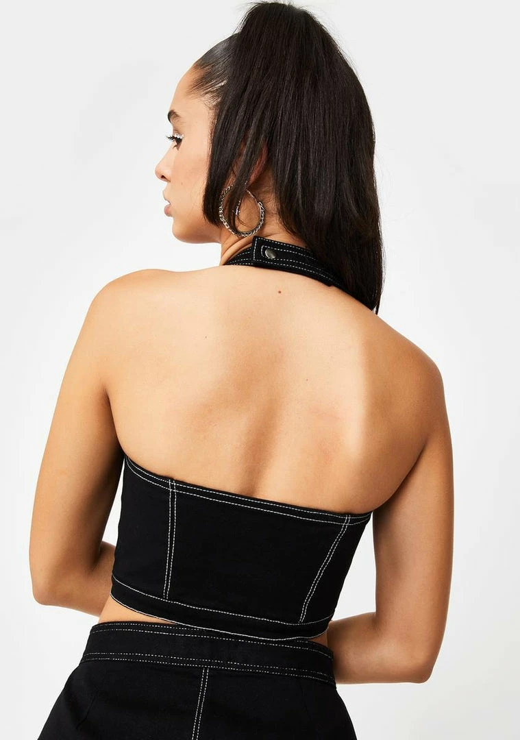 will have ya gettinâ that shmoney, sis! You deserve to be lavished in this hott crop top that has denim construction with dope contrast stitching, halter straps, Nâ a zip closure with an O-ring pull.