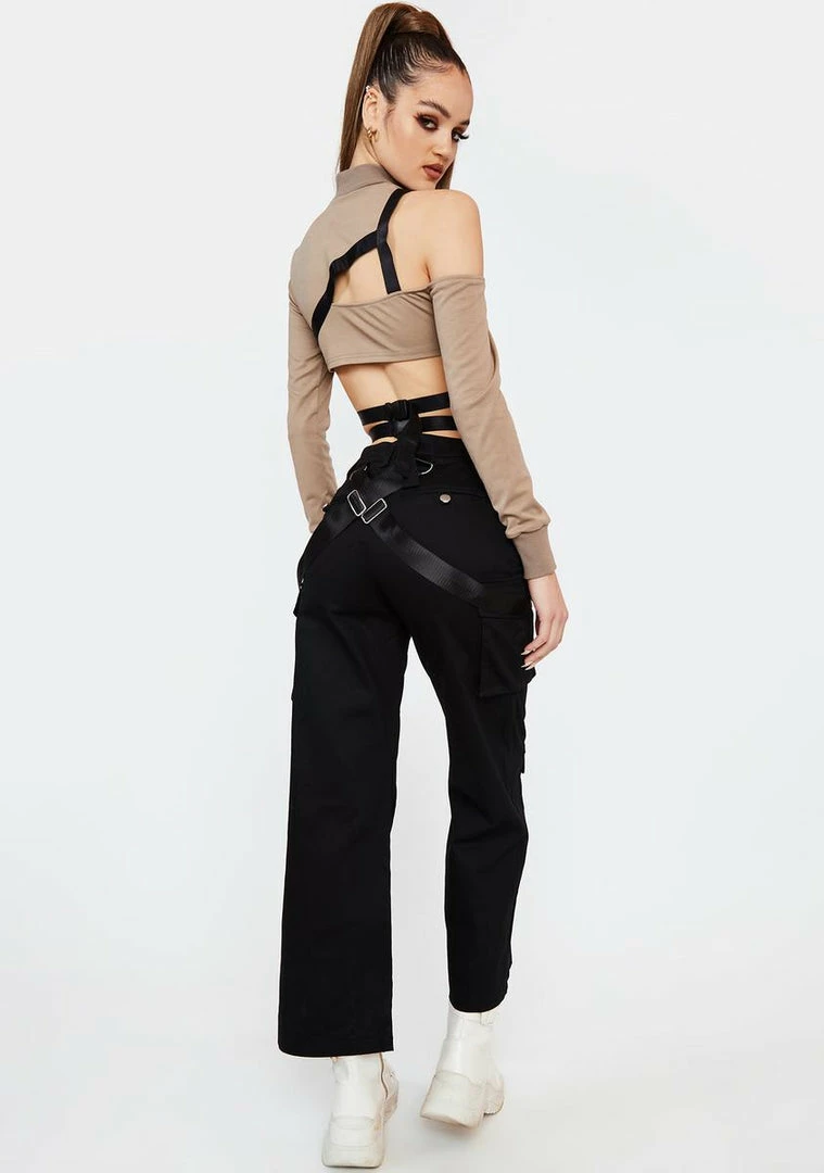 you’re trying to trip ’em up! These high-waist pants have crisscross woven nylon straps around the waist with D-ring hardware, exposed cargo pockets and zipper details, and a wide leg silhouette.
