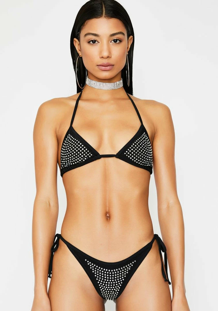 retail therapy is your new addiction babe. Money solves all ya problems in this humble bragginâ two-piece halter bikini set that has a triangle style, shimmerin’ rhinestones all ova, self tie side straps Nâ a cheeky fit.