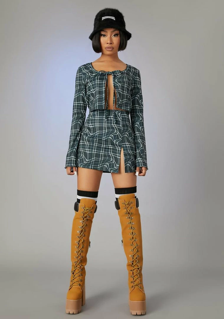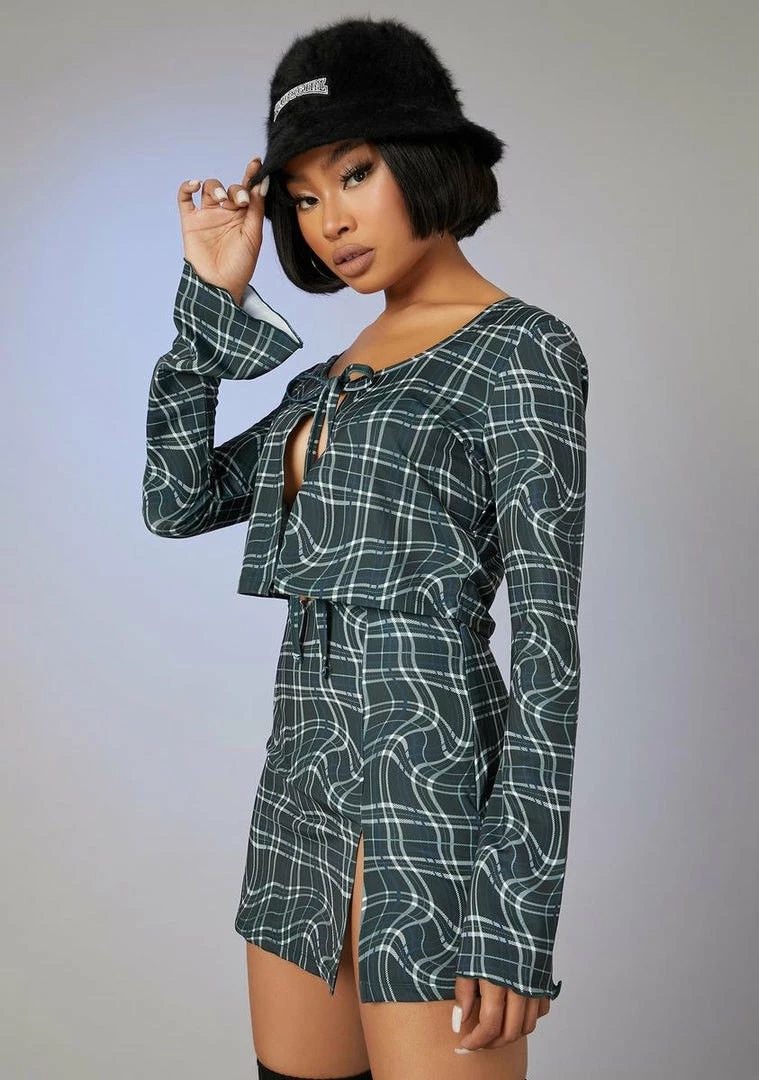 cuz you’re iconic in every way, babe. This wavy plaid print set includes long sleeve crop top with a front tie closure and a high waisted skirt with a side slit.