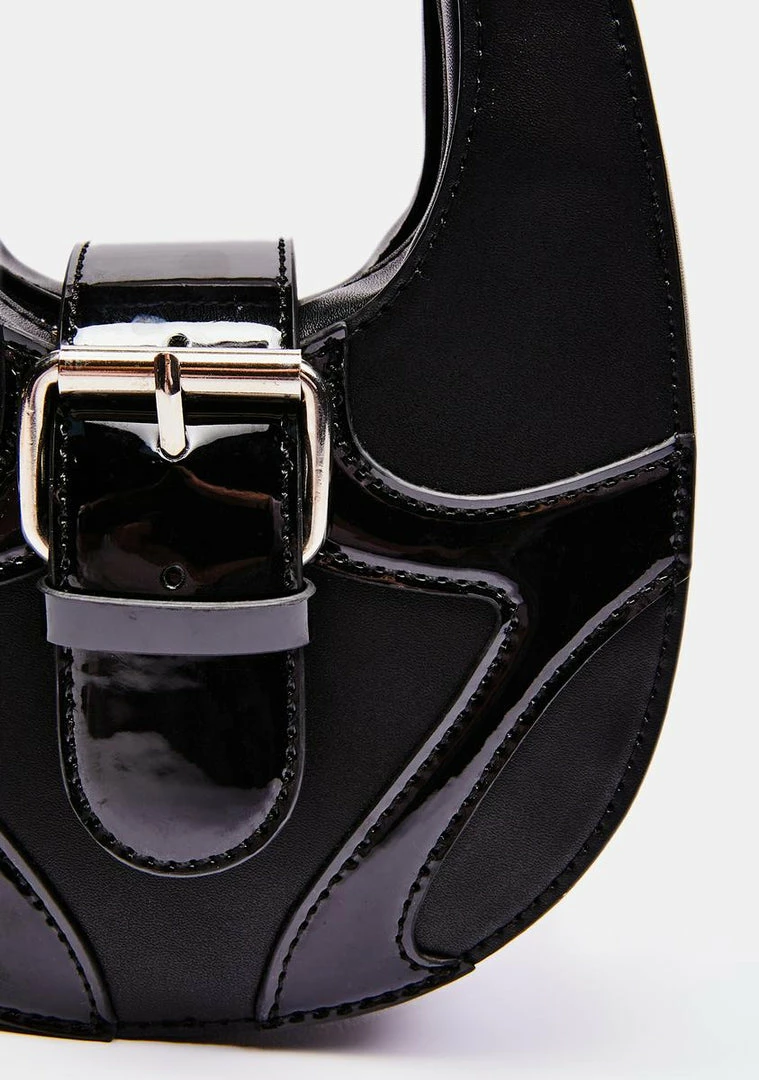 cuz you can’t be tamed! This mini purse has a mixed matte and patent vegan leather construction, a silver buckle strap on the front, and an embroidered brand logo patch on the back.