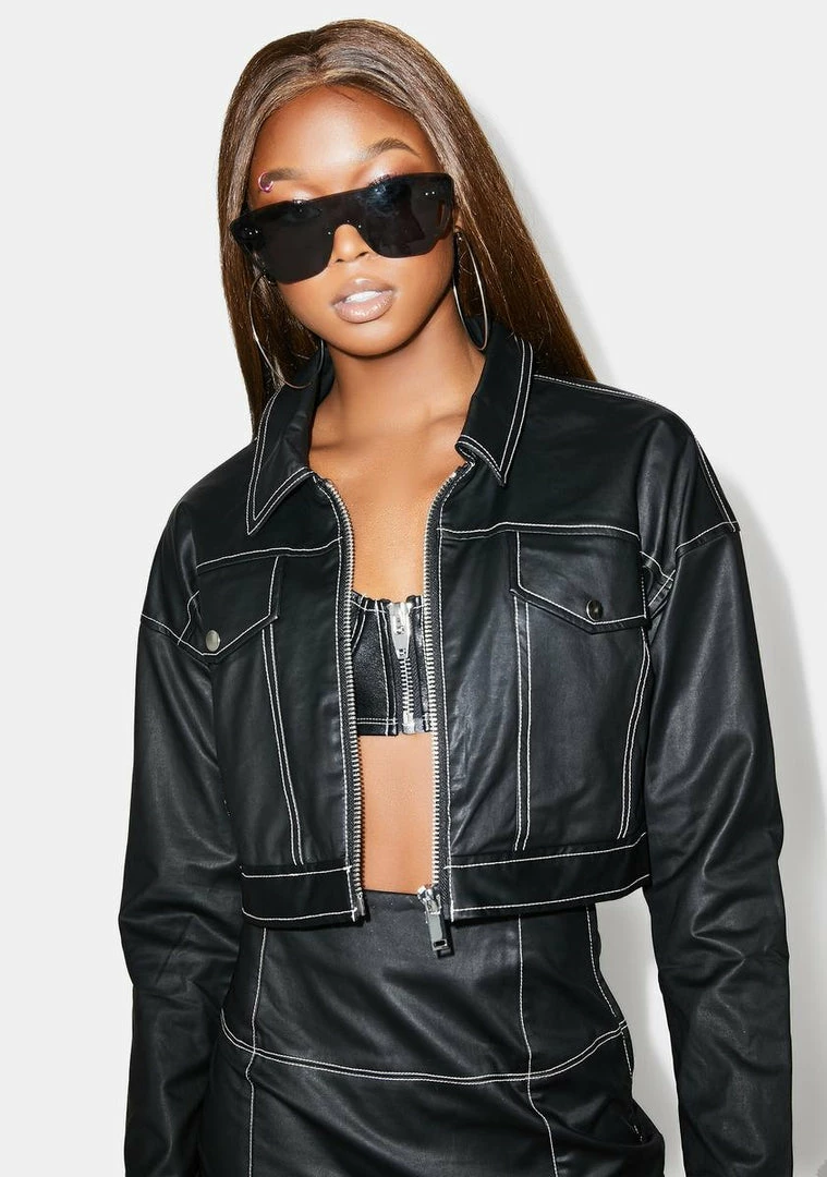 cuz itz nothing personal, baby! Ur in it for the $$$, not the friends, so make money movez in this boujee vegan leather jacket that has contrast stitching, chest pockets, a zip up front, and a cropped fit.