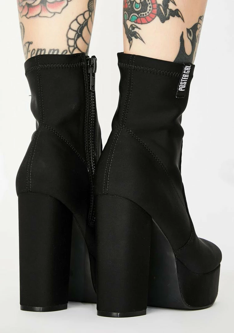 cuz you stomp all ova the competition! No one compares to you in these too sassy platform boots that have a thicc neoprene construction, chunky block heels, side zip closures Nâ branded logo tabs to let âem know who ya ride for.