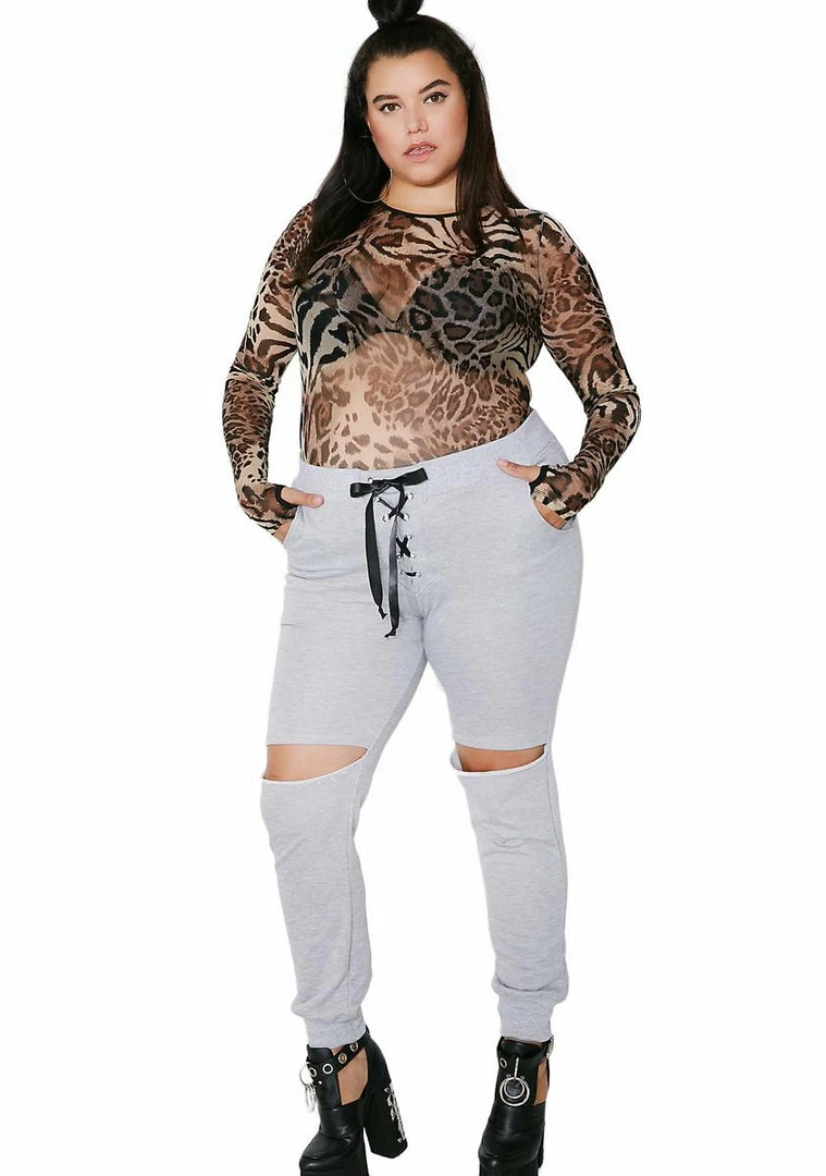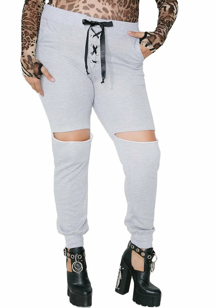 never go easy on âem, babe…these sikk joggers have a lilâ stretch to âem, distressed knees, pockets, lace-up detail and an elastic waistband.