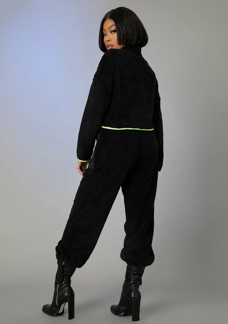 cuz youâll never run up on me. These cozy high waist joggers have a warm teddy bear fleece construction, quilted front patch pockets, neon contrast trim, and a belted waistline with a snap buckle closure.