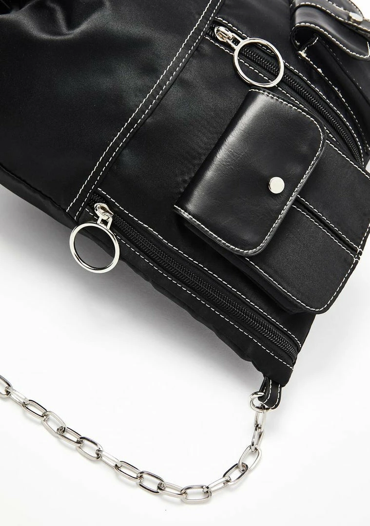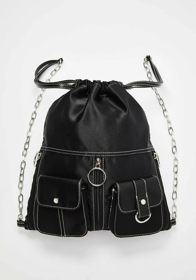 cuz youâre sick of their dumbazz DMâs! Hit the block Nâ go in this drawstring backpack that has two front pockets, O-ring zipper hardware, and chunky chain straps.