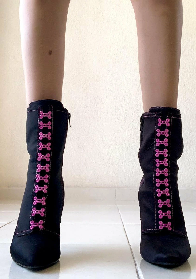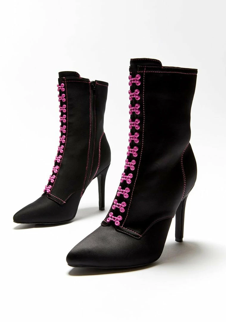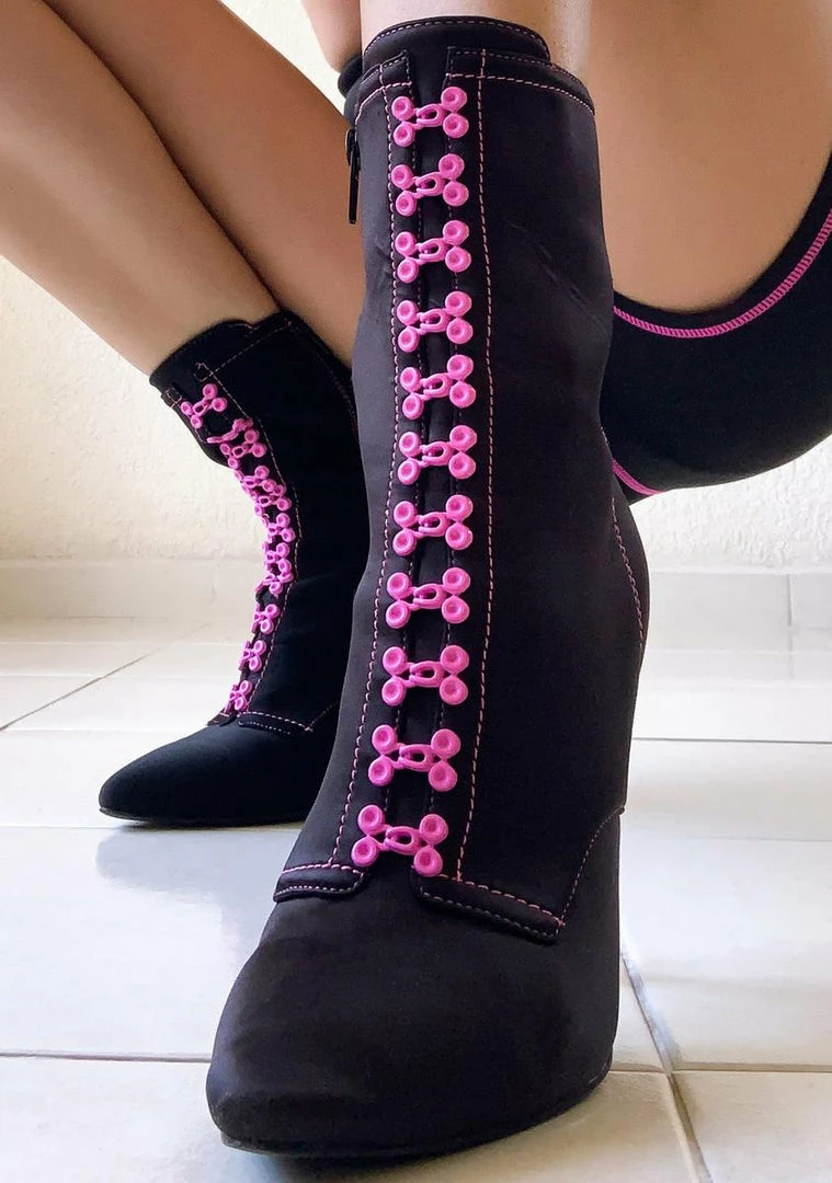 cuz u know how to werk a stage bb! Make em throw sum mo in these supa chic ankle booties with a stiletto heel, neon contrast stitch details, a pointy toe and hook and eye closures all the way up the front.