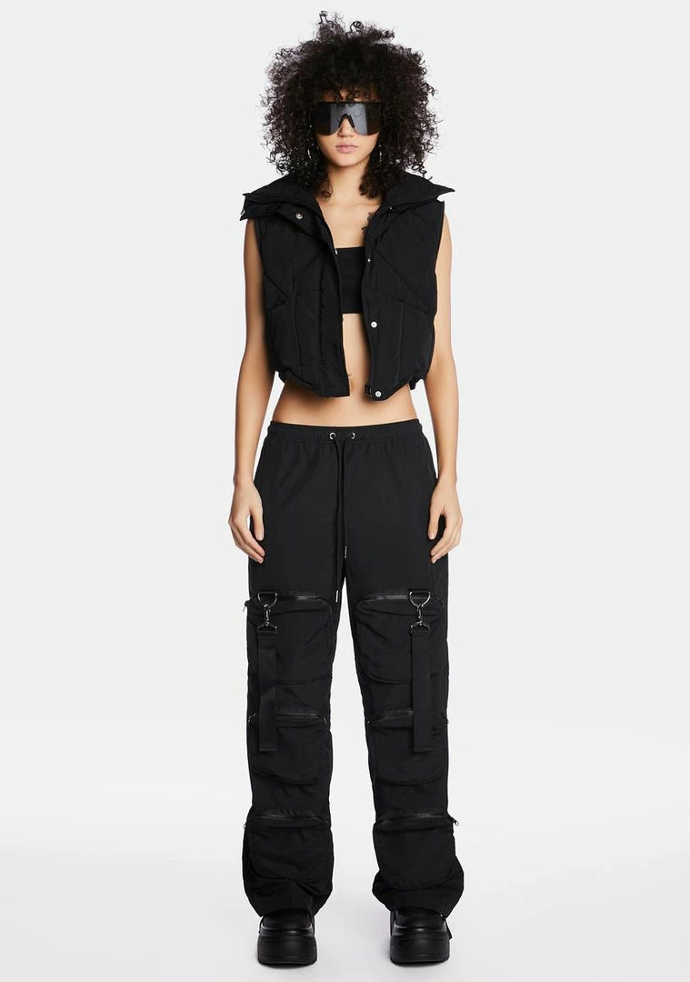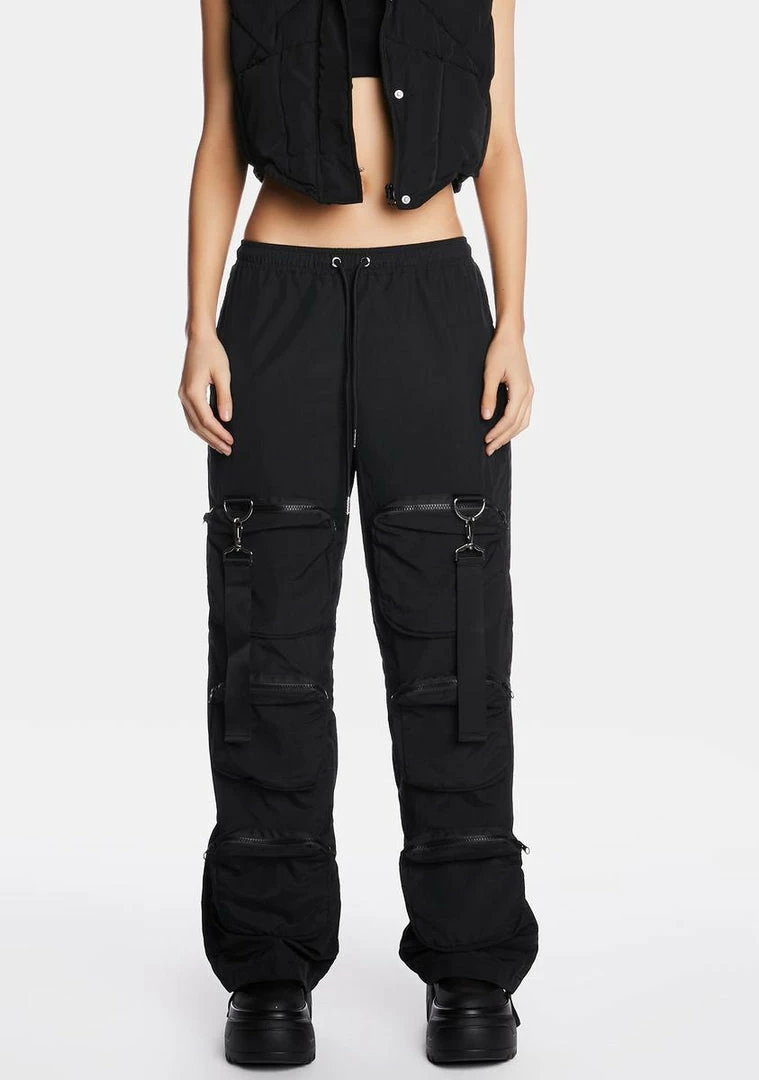 expect no less. These baggy low-rise pants have a lightweight nylon construction, a stretchy elastic waistband with adjustable ties, zippered leg pockets, decorative straps with D-ring and clasp hardware, back hook-and-loop pockets, and self-ties at the hem.