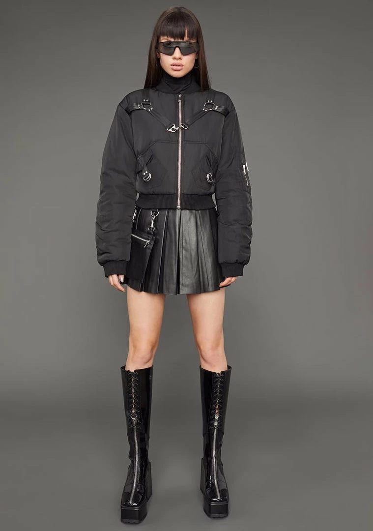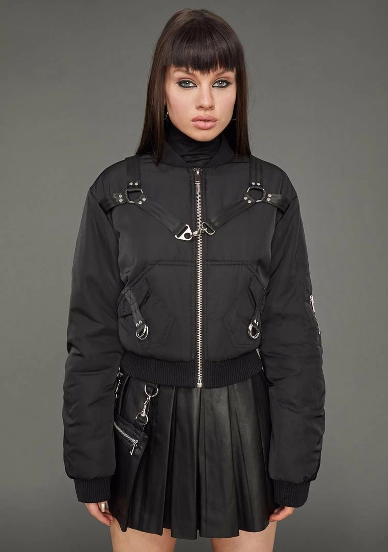 keep it on the down low. This bomber jacket has a cropped fit, decorative cross straps with adjustable buckles and O-ring hardware, and a front zipper closure.