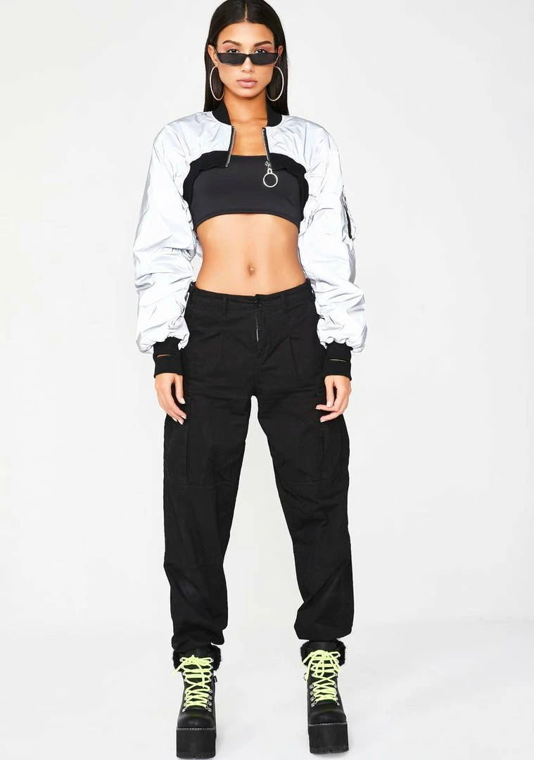 cuz ya style always stays fresh. This dope bomber jacket has a supa cropped fit Nâ thumb holes on the cuffs thatâll have ya lookinâ like the baddest babe around.