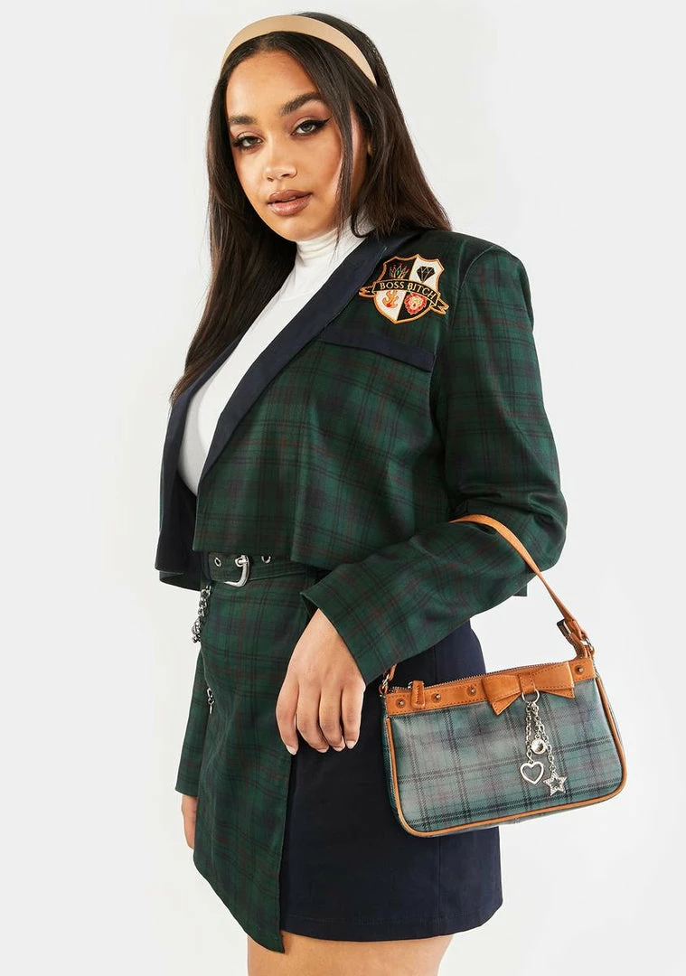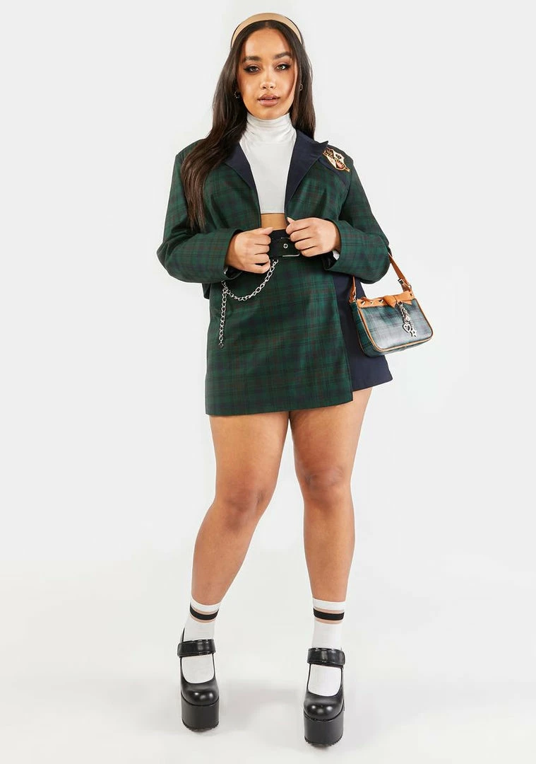 cuz ur anything but ordinary. This blazer has a cropped waist, a longline collar, long sleeves, a chest pocket and embroidered crest patch, and a plaid pattern all over.