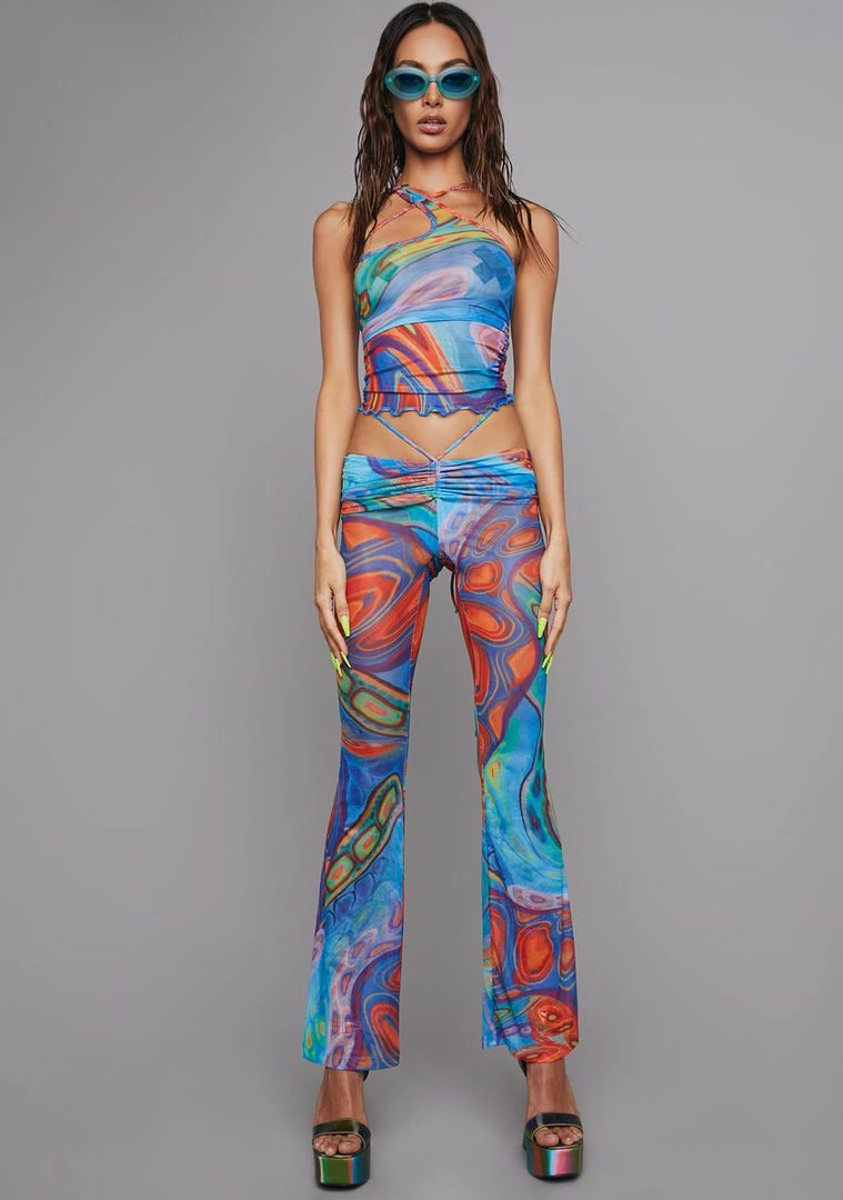 cuz you’ve got hypnotic habits! This asymmetrical crop tank and strappy flared pants set has a mesh construction with a colorful trippy print all over, lettuce edge trim, a low rise fit with a built-in panty liner, and adjustable ruched drawstrings.